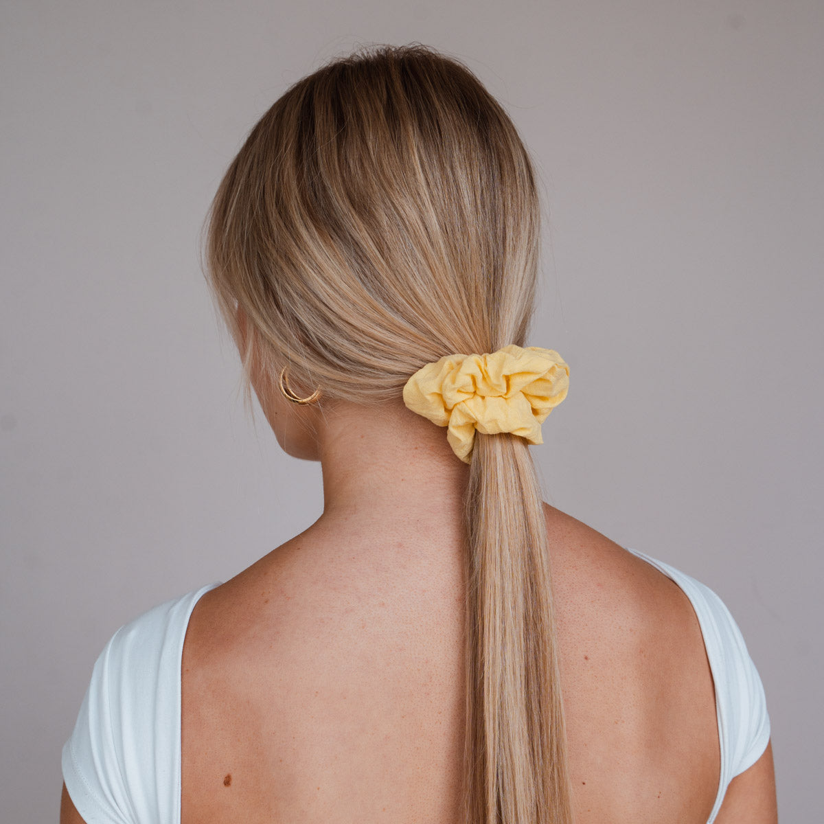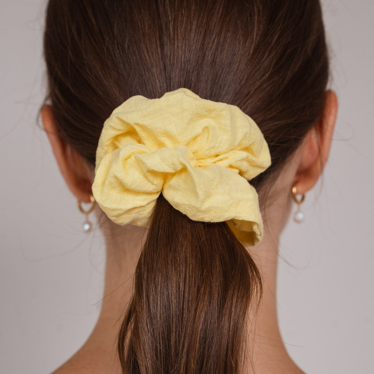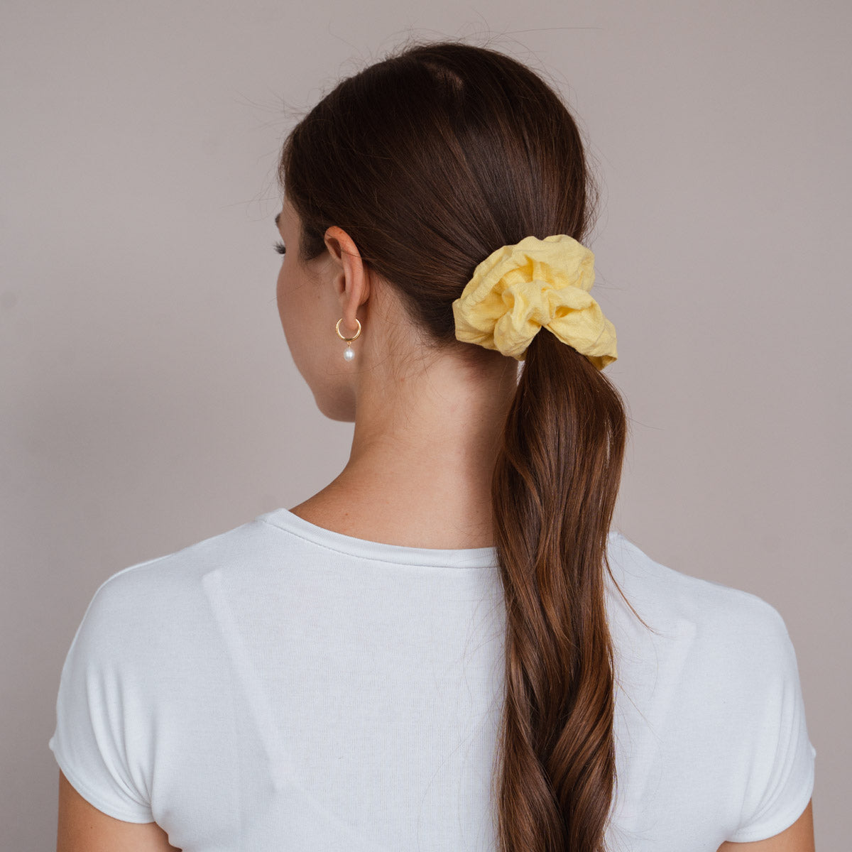 Unser Aven Scrunchie in zartem Pastellgelb bringt sofort gute Laune in deinen Alltag. Hergestellt aus 100 % Baumwolle, überzeugt er mit einem natürlichen Look und einem angenehm weichen Tragegefühl – perfekt im Haar oder als sommerliches Detail ums Handgelenk.