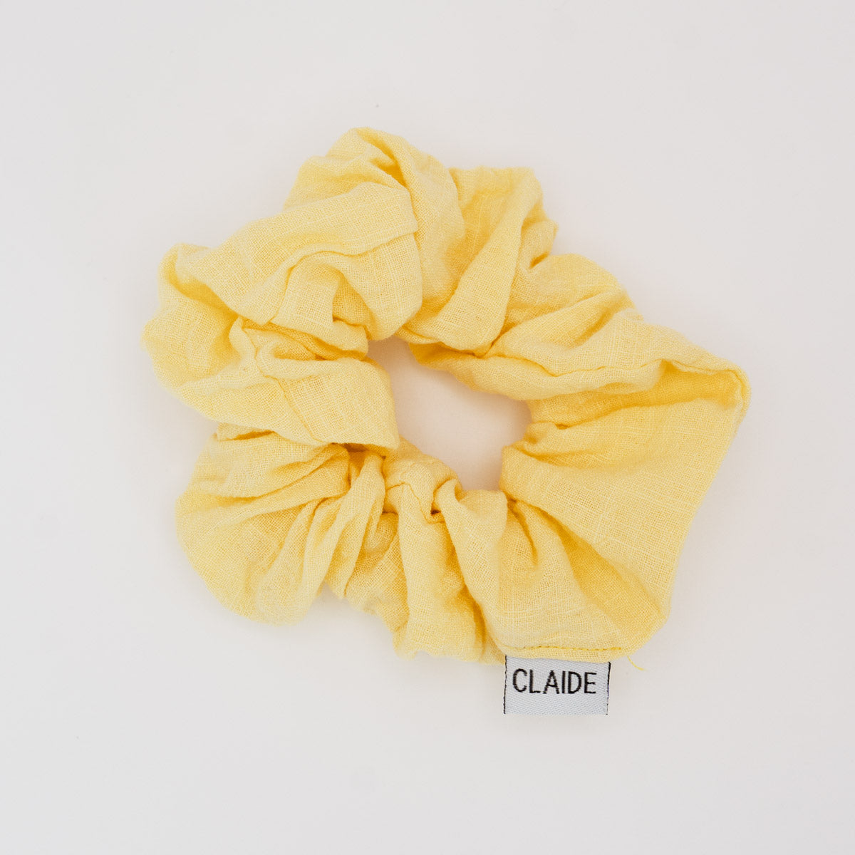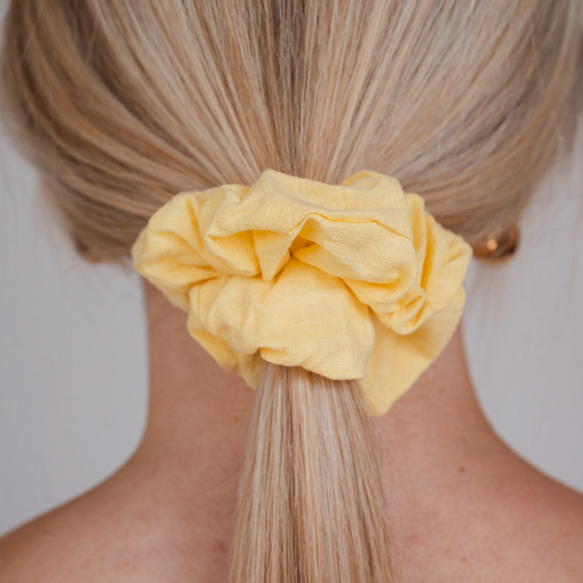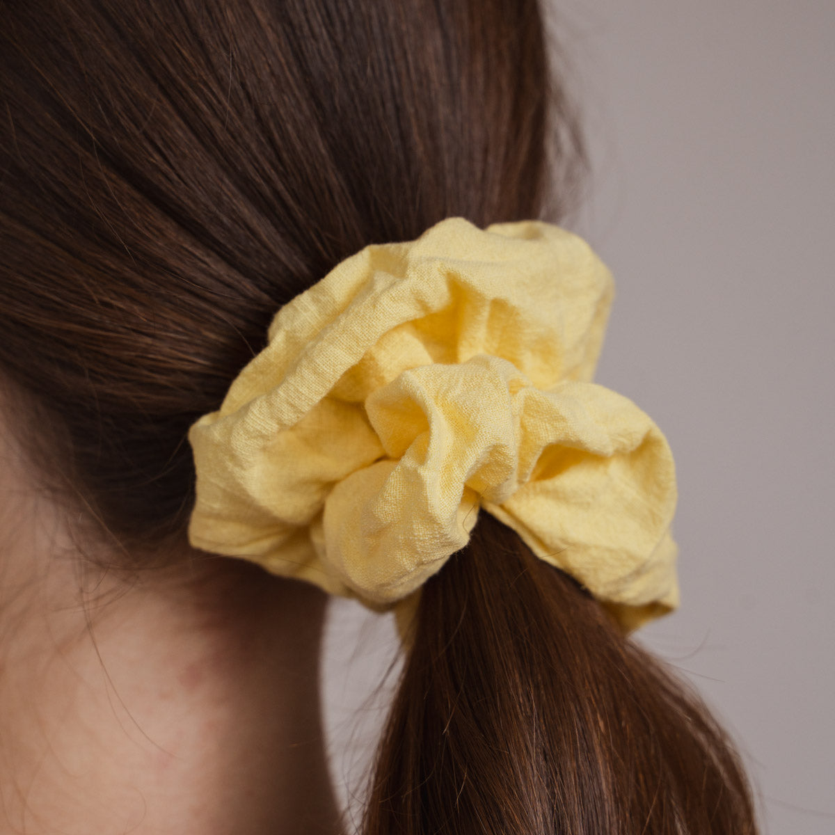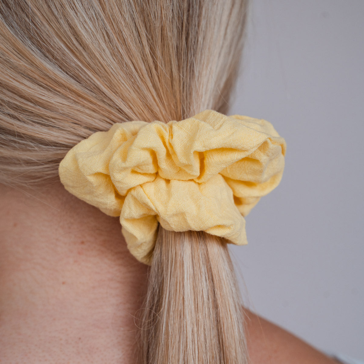Unser Aven Scrunchie in zartem Pastellgelb bringt sofort gute Laune in deinen Alltag. Hergestellt aus 100 % Baumwolle, überzeugt er mit einem natürlichen Look und einem angenehm weichen Tragegefühl – perfekt im Haar oder als sommerliches Detail ums Handgelenk.