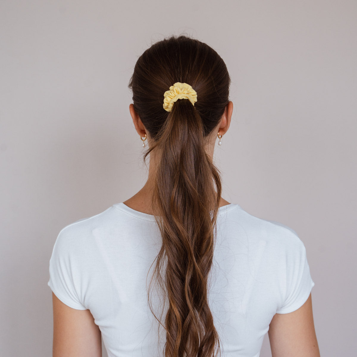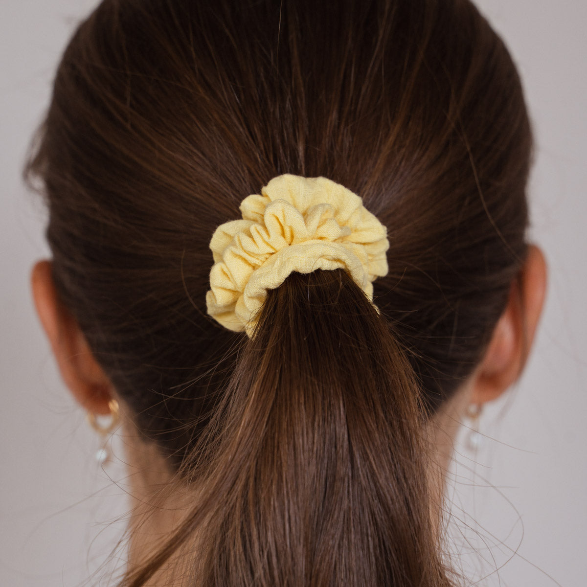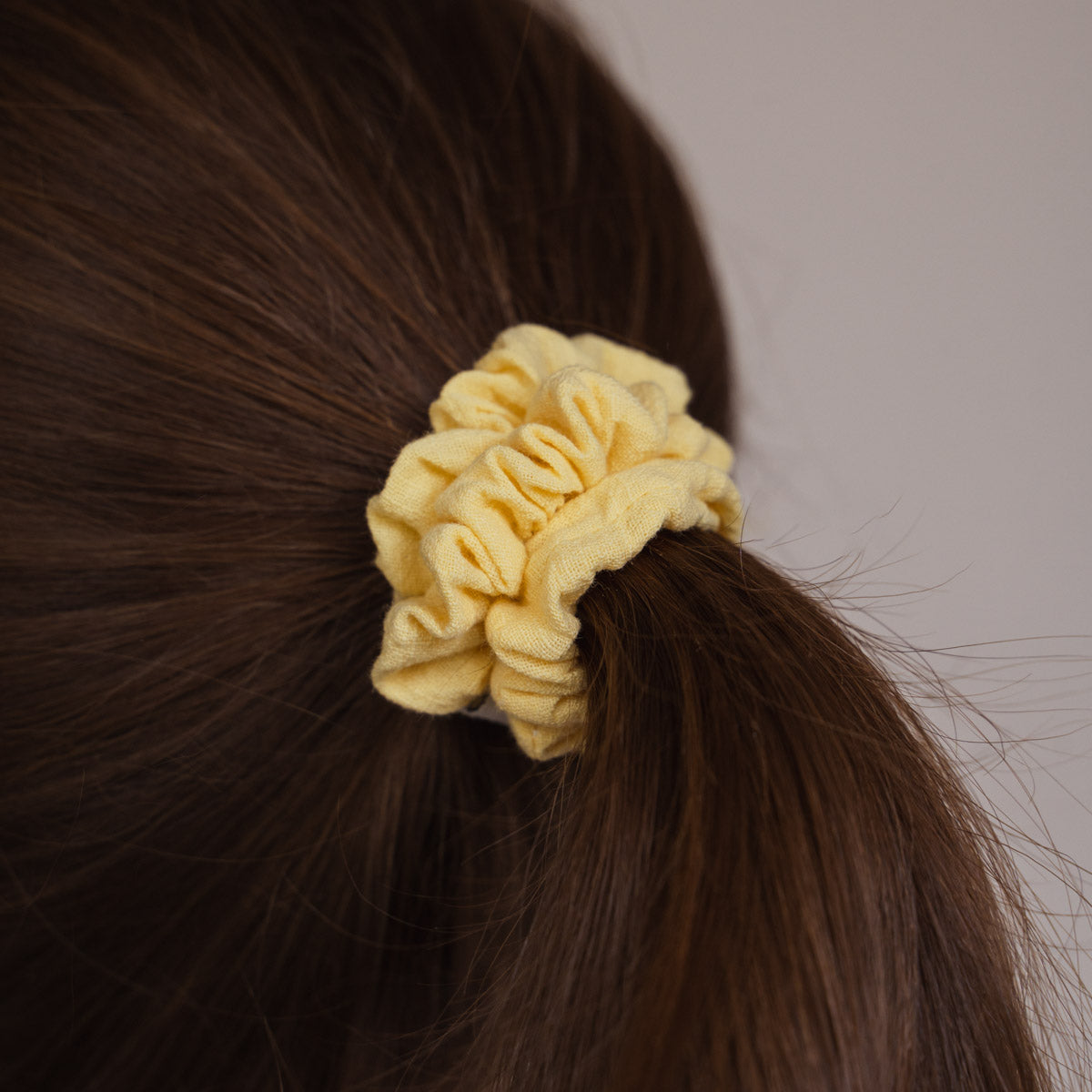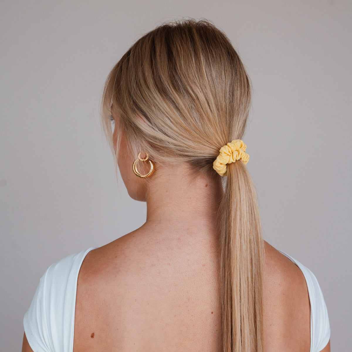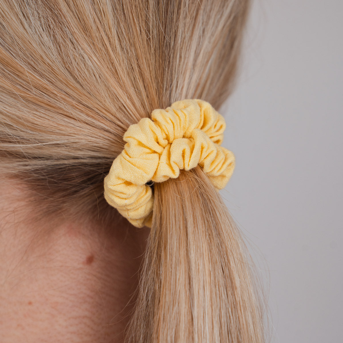 Unser Liv Scrunchie aus 100 % Baumwolle ist der perfekte Farbtupfer für deinen Alltag. In frischem Gelb bringt er sofort gute Laune in deine Frisur – ob als Mini-Dutt, halber Zopf oder süßes Accessoire ums Handgelenk.