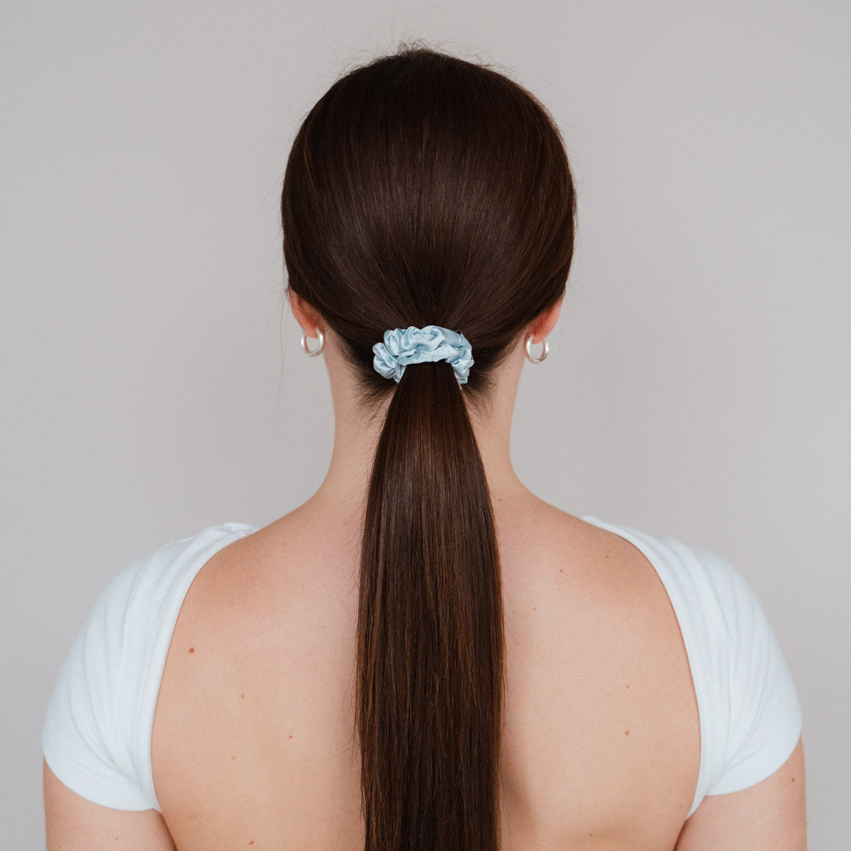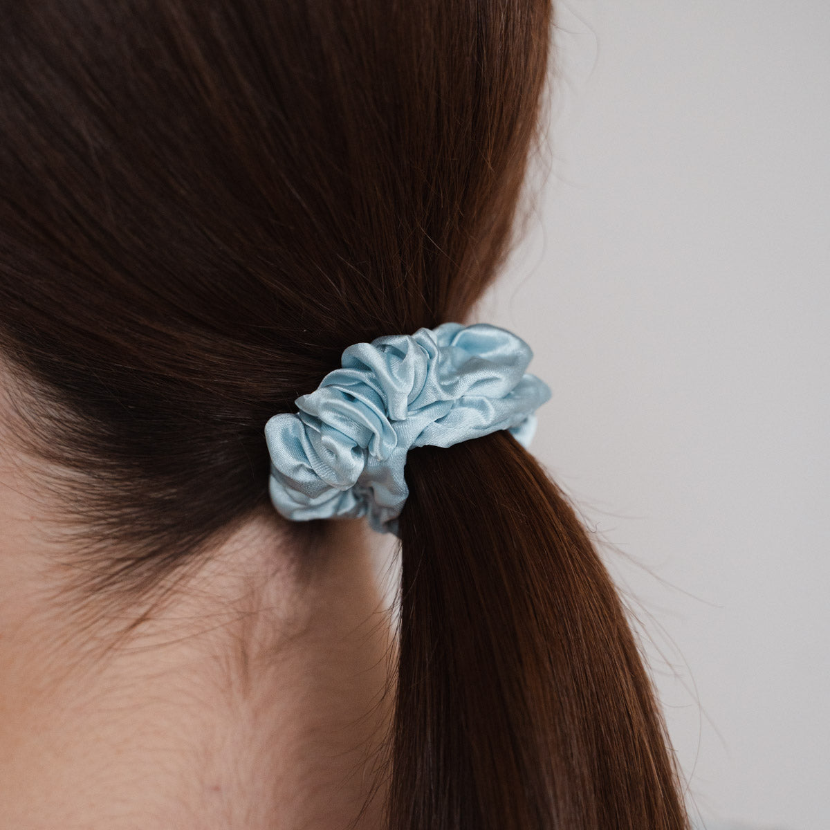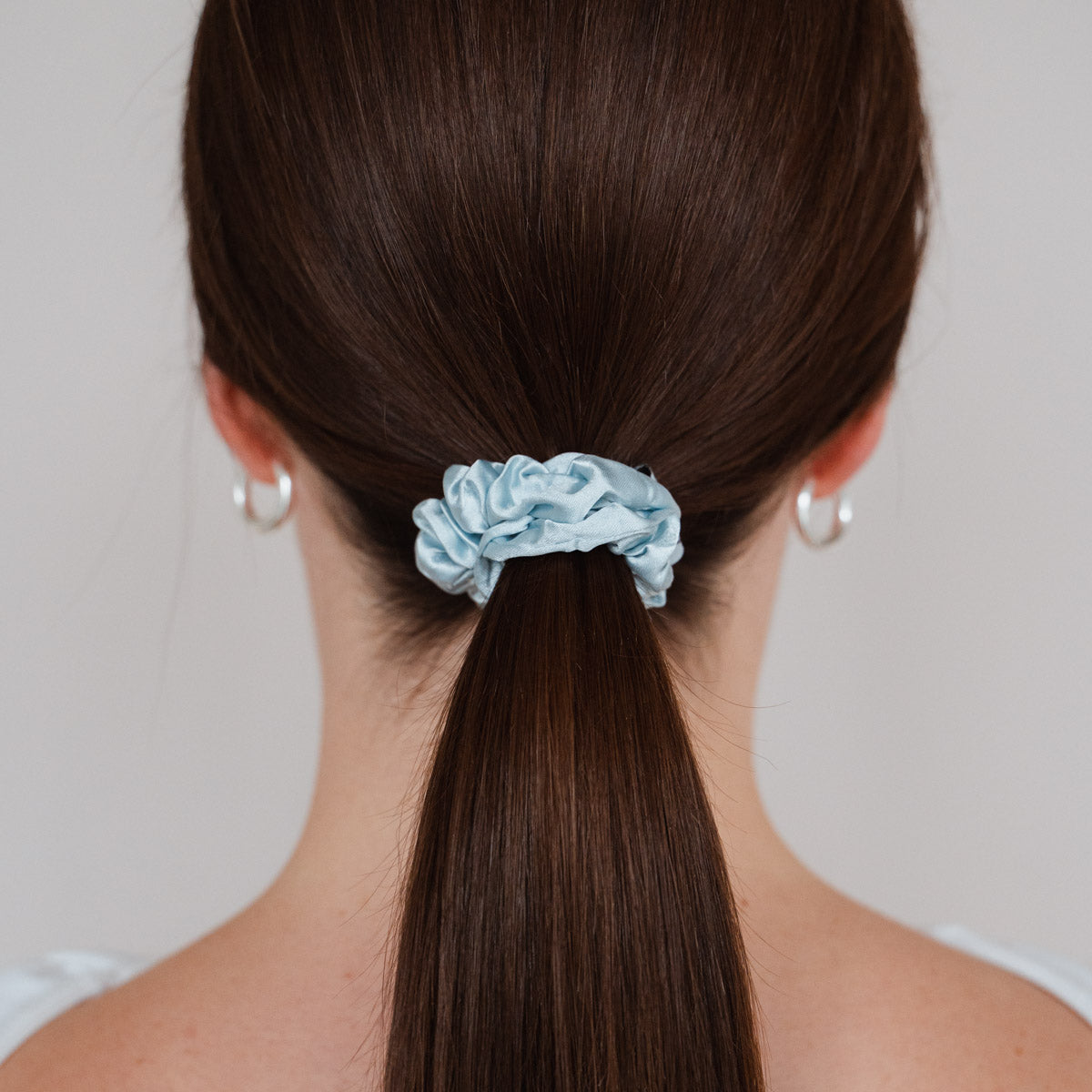 Entdecke unseren Manon Scrunchie und bringe deine Frisuren auf das nächste Level! Mit seinem besonderem Babyblau Design und seiner kompakten Größe ist er perfekt für unterwegs und lässt sich problemlos in jeder Tasche oder am Handgelenk verstauen. Der Manon Scrunchie eignet sich sowohl für feineres, als auch dickeres Haar. Lass dich von der besonderen Magie unserer Scrunchies aus Satin Seide verführen und du wirst nie wieder herkömmliche Haargummis verwenden wollen.