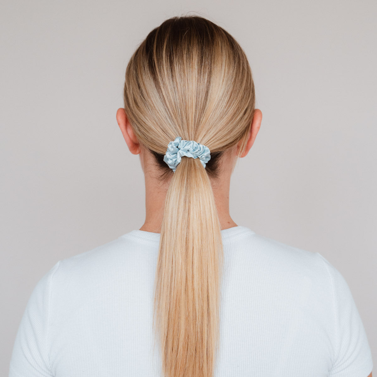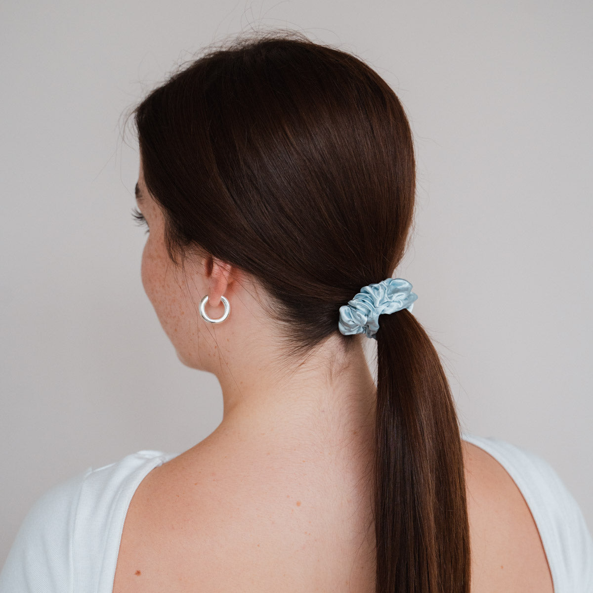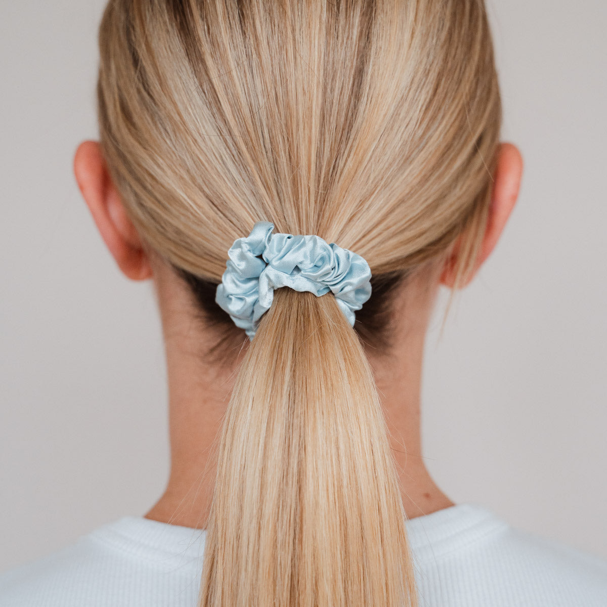 Entdecke unseren Manon Scrunchie und bringe deine Frisuren auf das nächste Level! Mit seinem besonderem Babyblau Design und seiner kompakten Größe ist er perfekt für unterwegs und lässt sich problemlos in jeder Tasche oder am Handgelenk verstauen. Der Manon Scrunchie eignet sich sowohl für feineres, als auch dickeres Haar. Lass dich von der besonderen Magie unserer Scrunchies aus Satin Seide verführen und du wirst nie wieder herkömmliche Haargummis verwenden wollen.