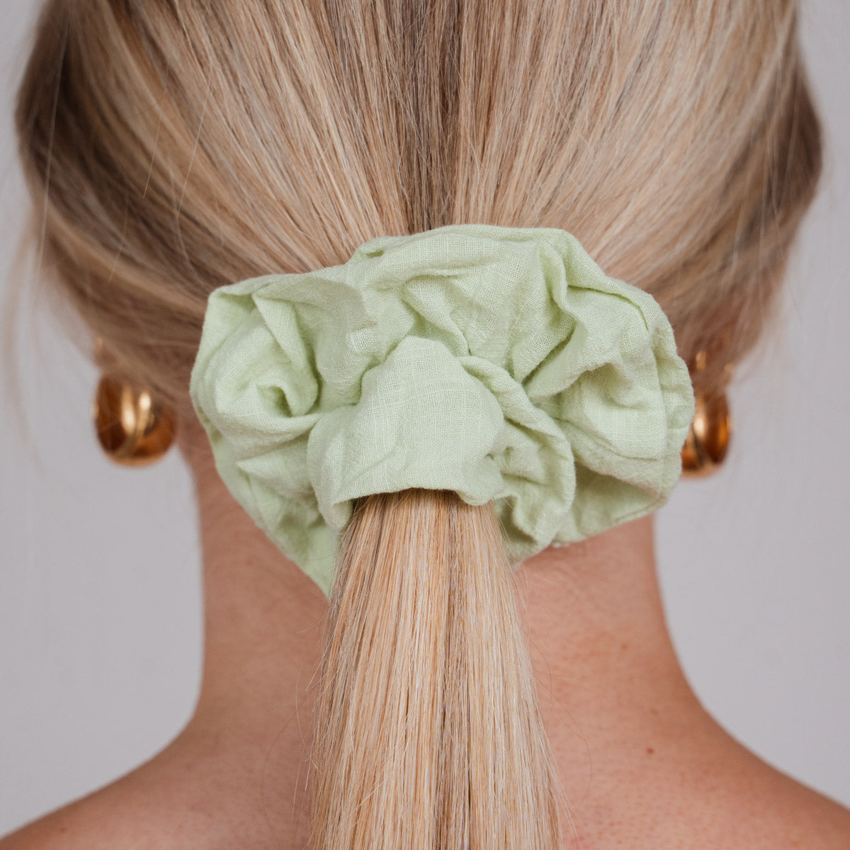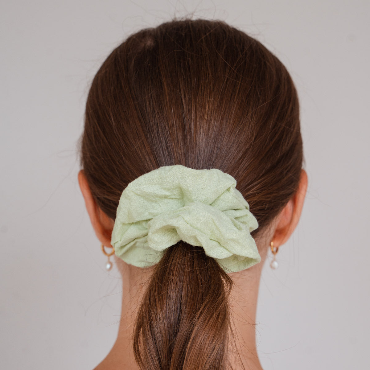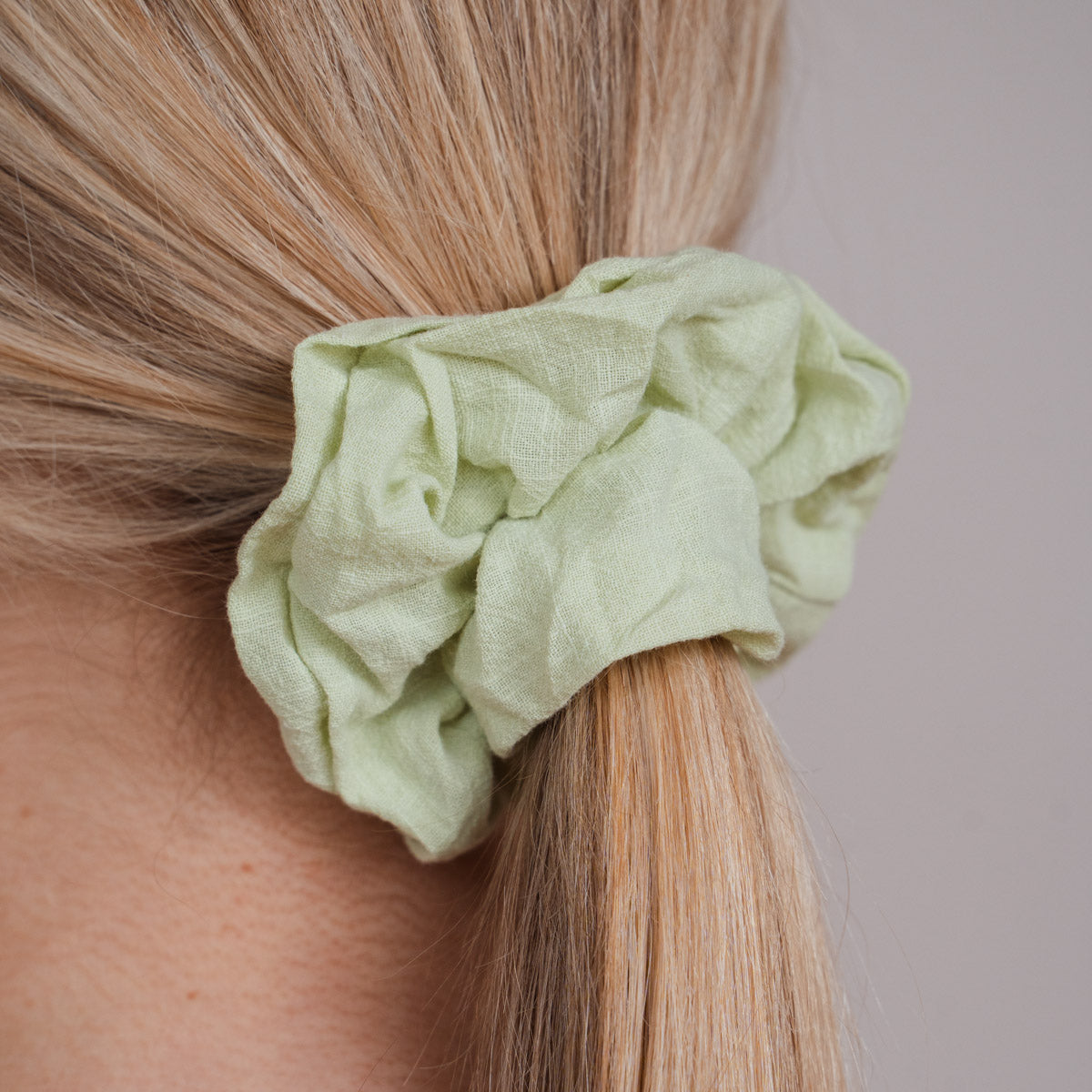 Unser Sage Scrunchie in zartem Pastellgrün bringt ruhige Frische und sanfte Natürlichkeit in dein Styling. Gefertigt aus 100 % Baumwolle, liegt er angenehm weich am Haar und ist auch ums Handgelenk ein dezenter Hingucker.