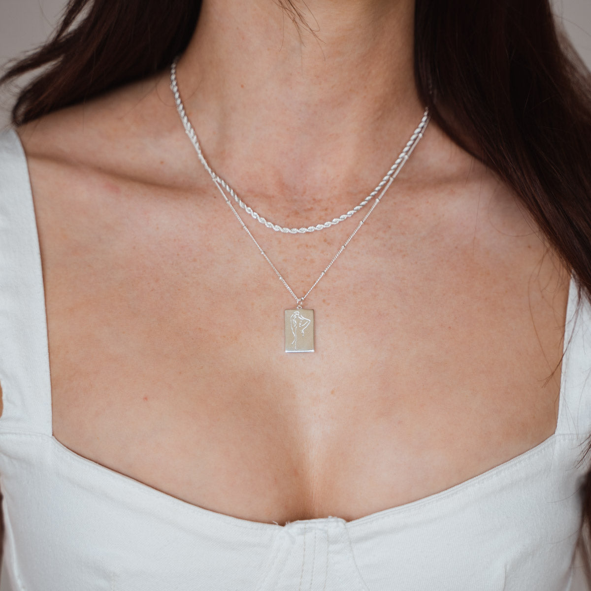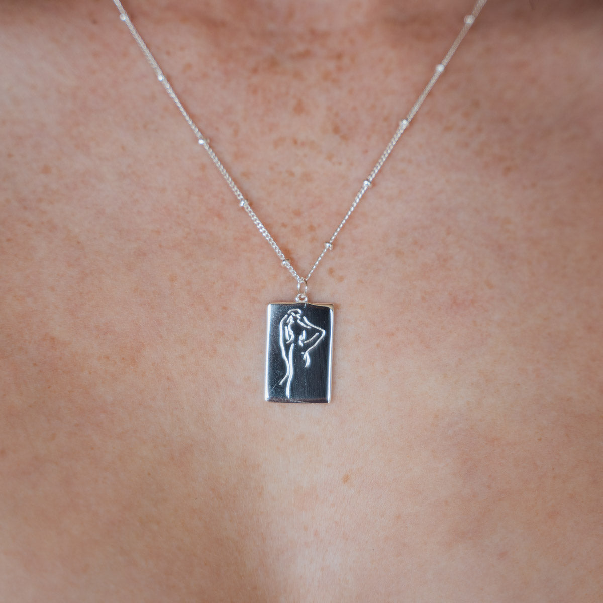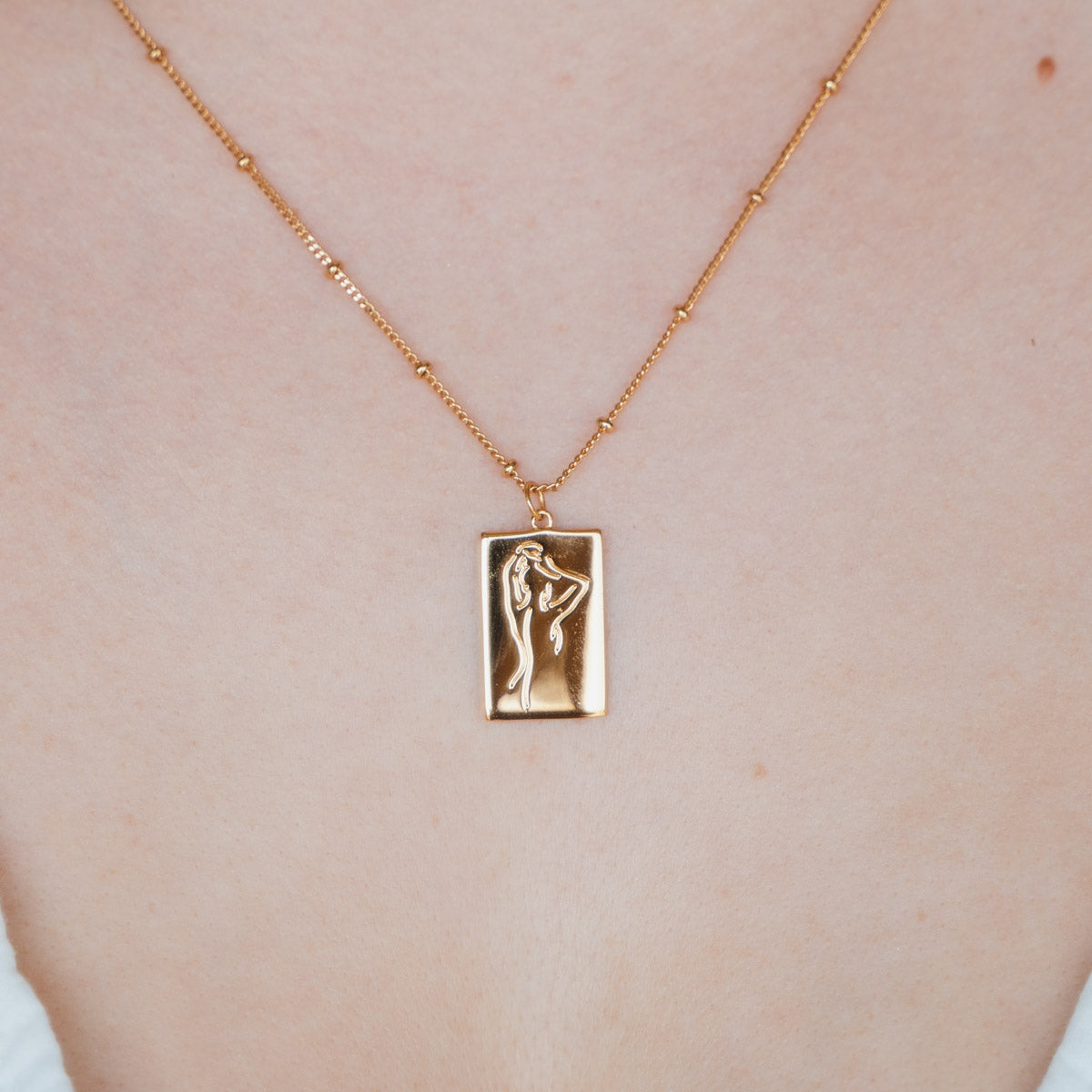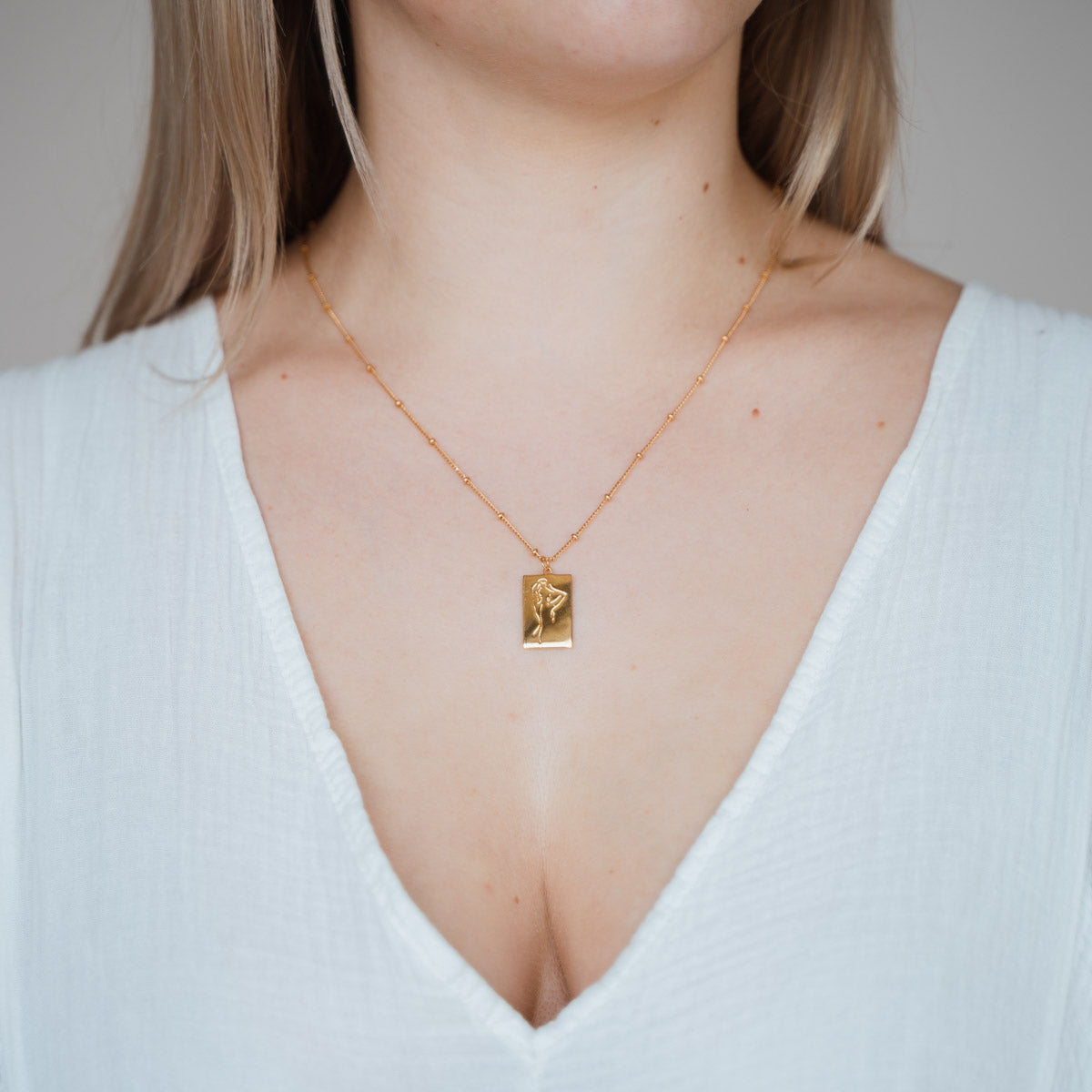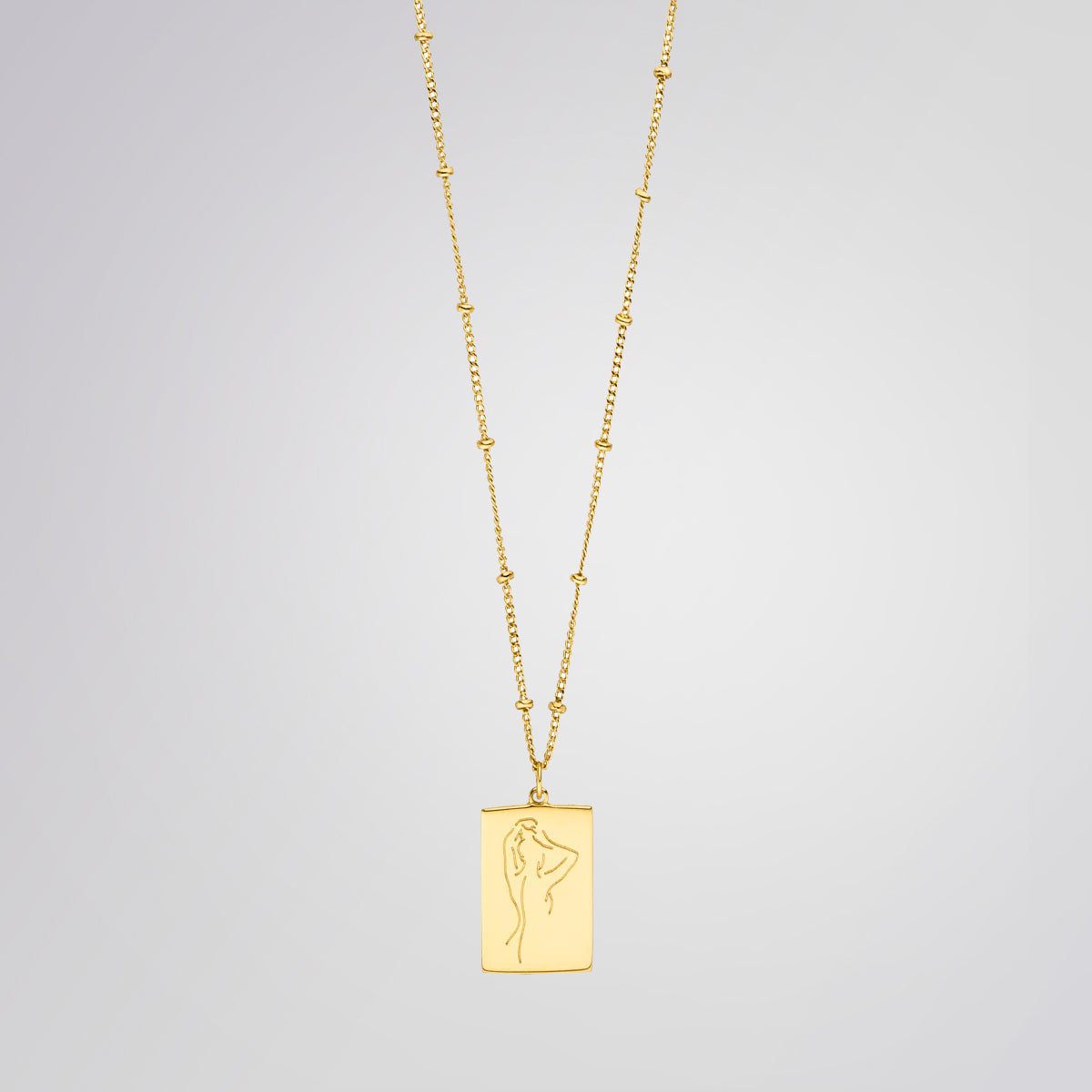 Die Halskette Belle gibt es Silber & Gold mit hochwertiger 18K Mehrfachvergoldung. Die Kette selbst besitzt kleine hübsche Applikationen. Das Highlight dieser Halskette ist der ansprechende Anhänger mit der schematischen Rückansicht von „Belle“ - einer Frau. Die Kette soll die Trägerin in Ihrem Körpergefühl bestärken und sie immer daran erinnern wie schön der weibliche Körper ist.