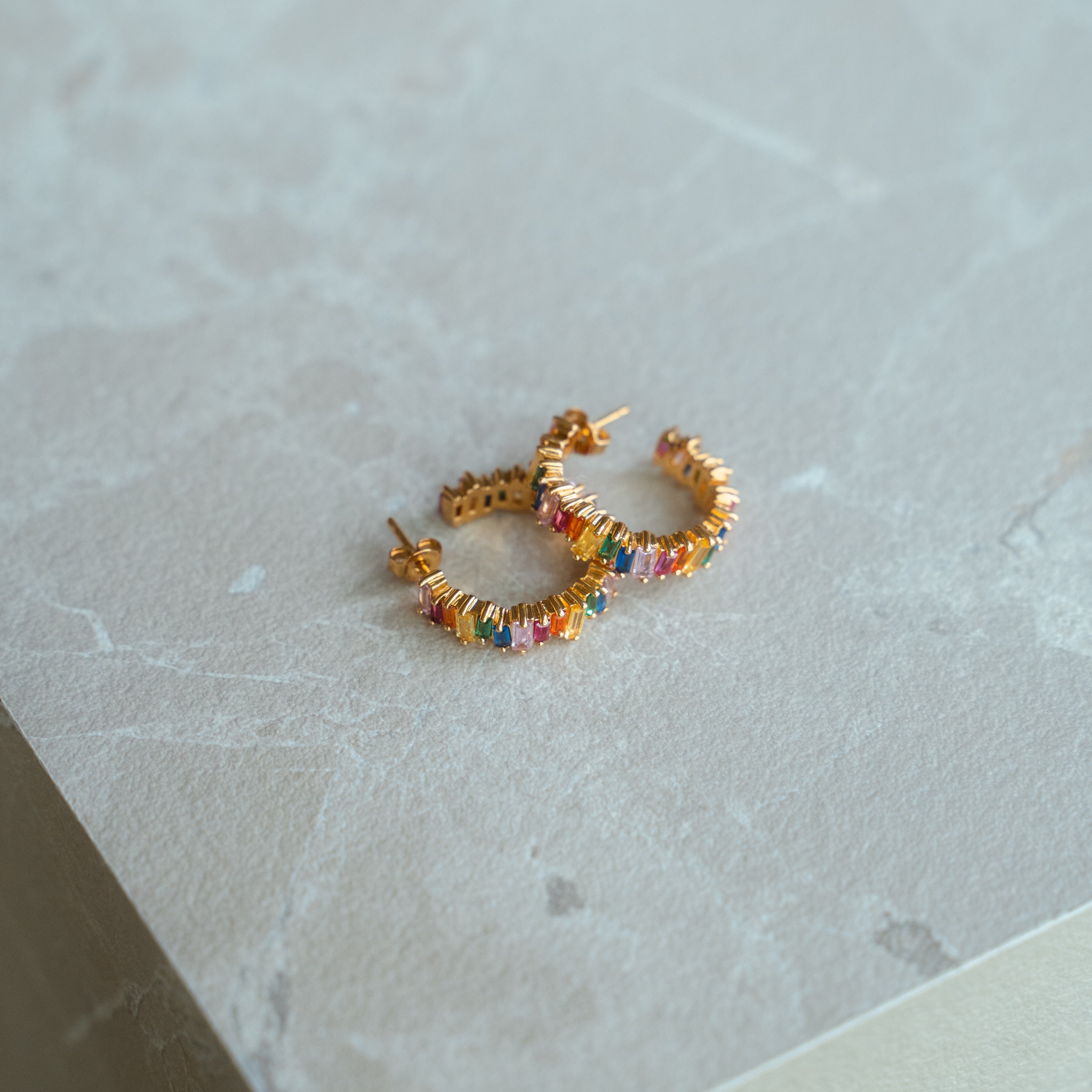 Entdecke die strahlenden Brenda Ohrringe mit bunten Steinchen, die perfekt für den Sommer sind! Mit ihrem fröhlichen und lebendigen Design verleihen sie deinem Look eine erfrischende Note und lassen dich die warmen Sonnenstrahlen voll und ganz genießen.