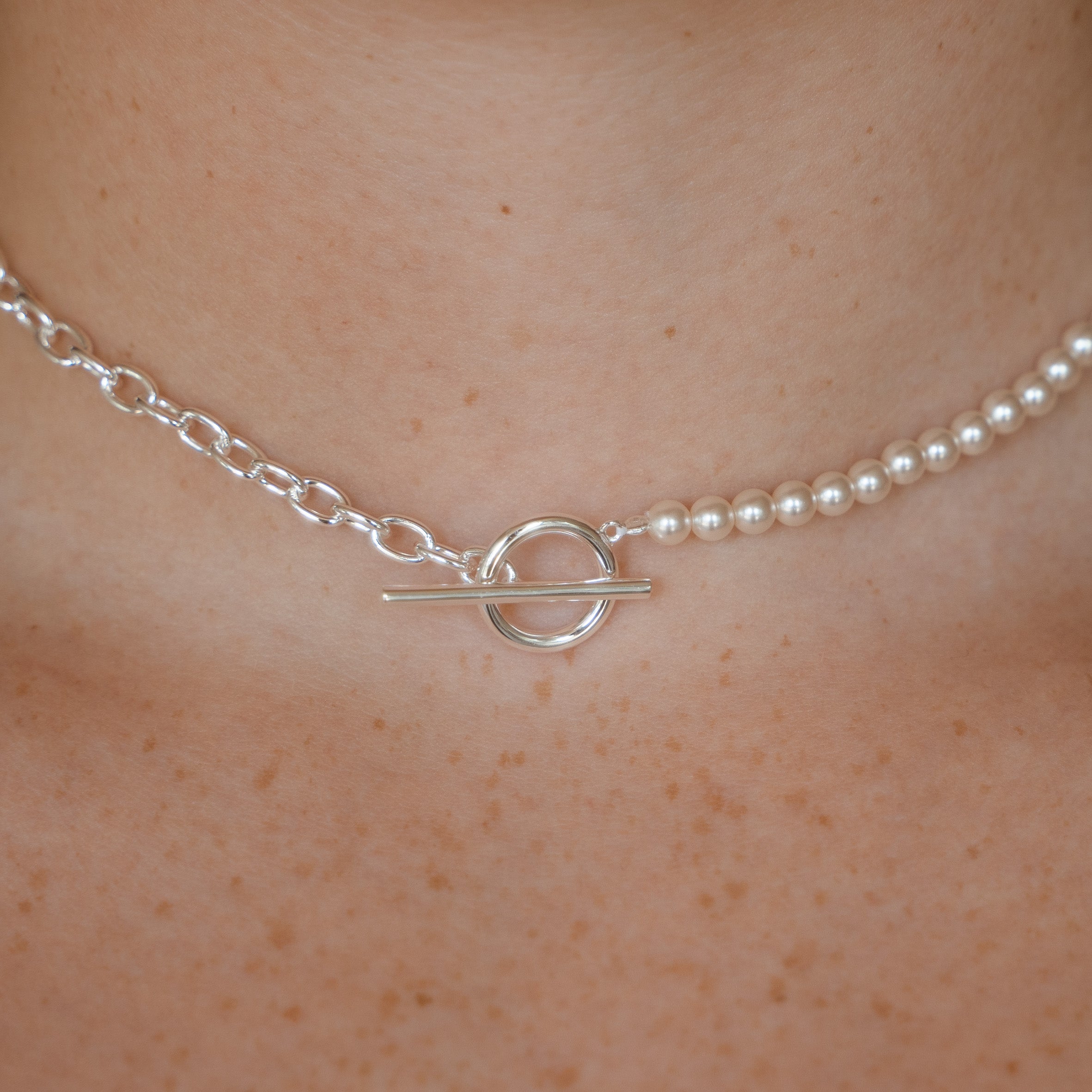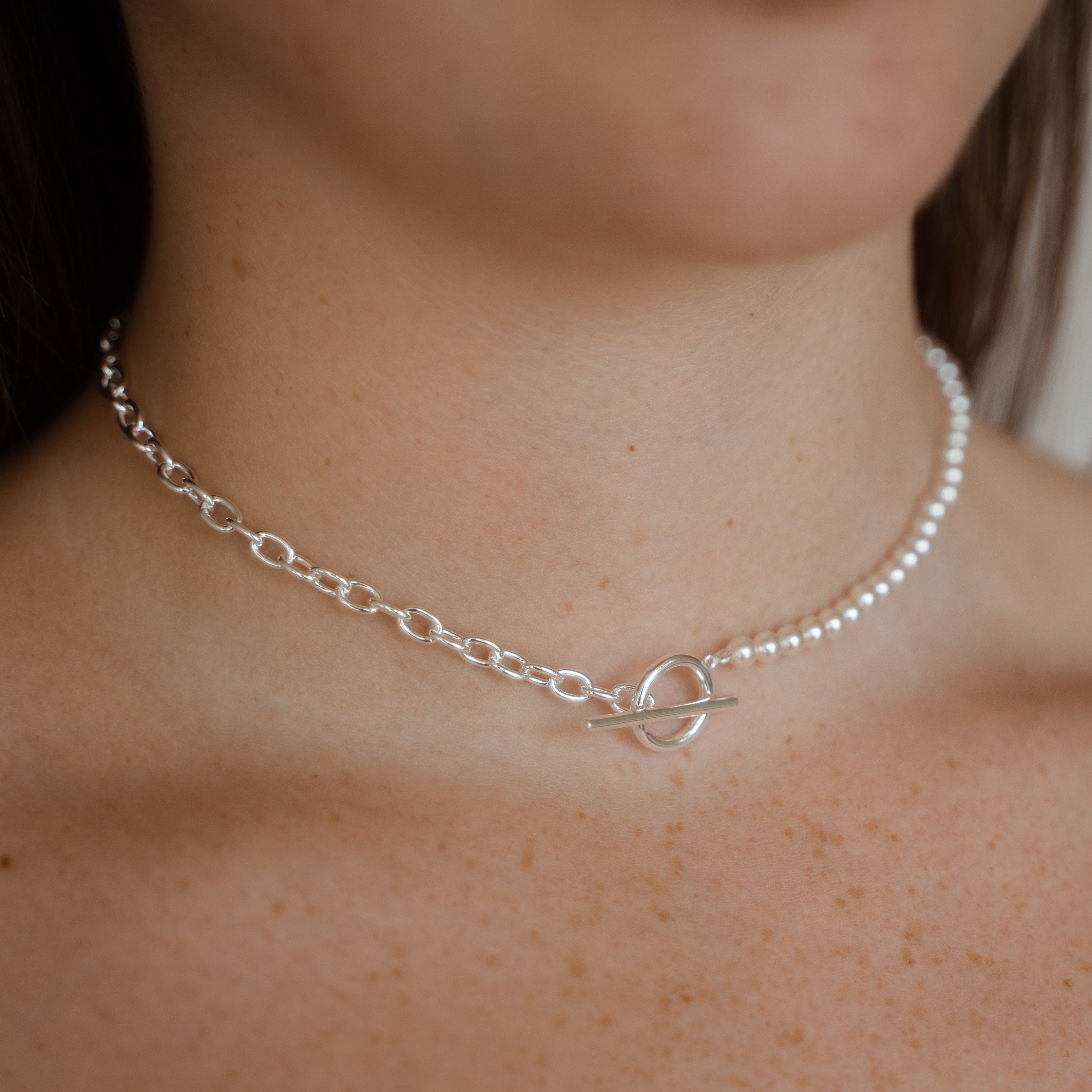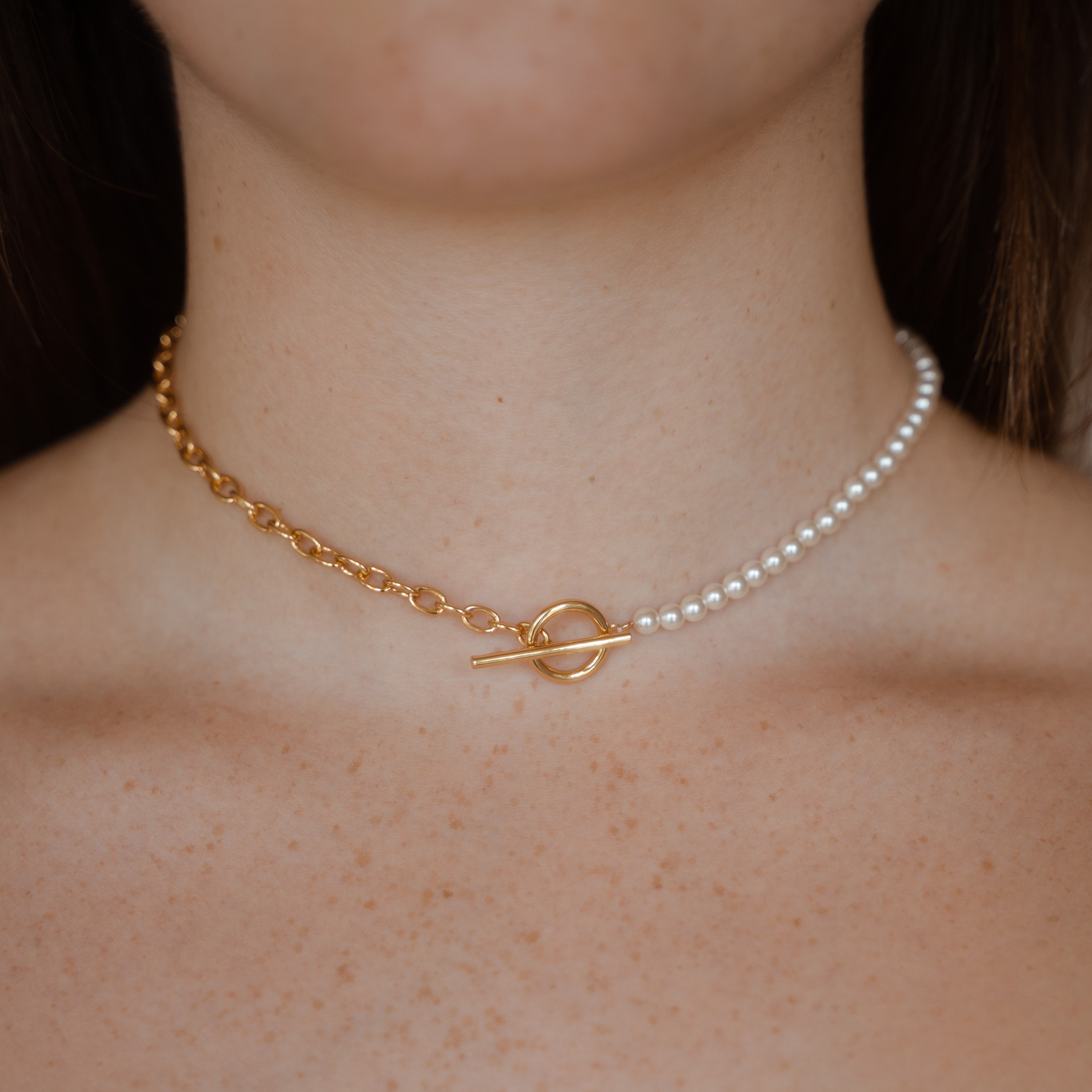 Verleihe deinem Stil mit der Maisie Choker Halskette eine neue Dimension. Der T-Bar Verschluss schafft eine harmonische Verschmelzung aus Halb Kette, halb Perle, und setzt ein Statement der Raffinesse.