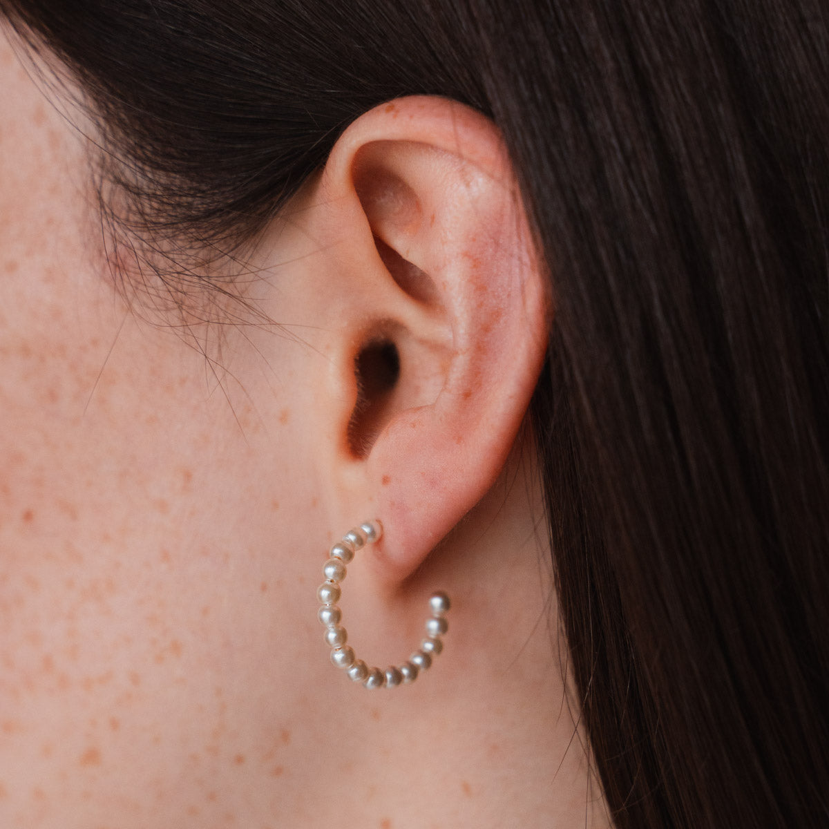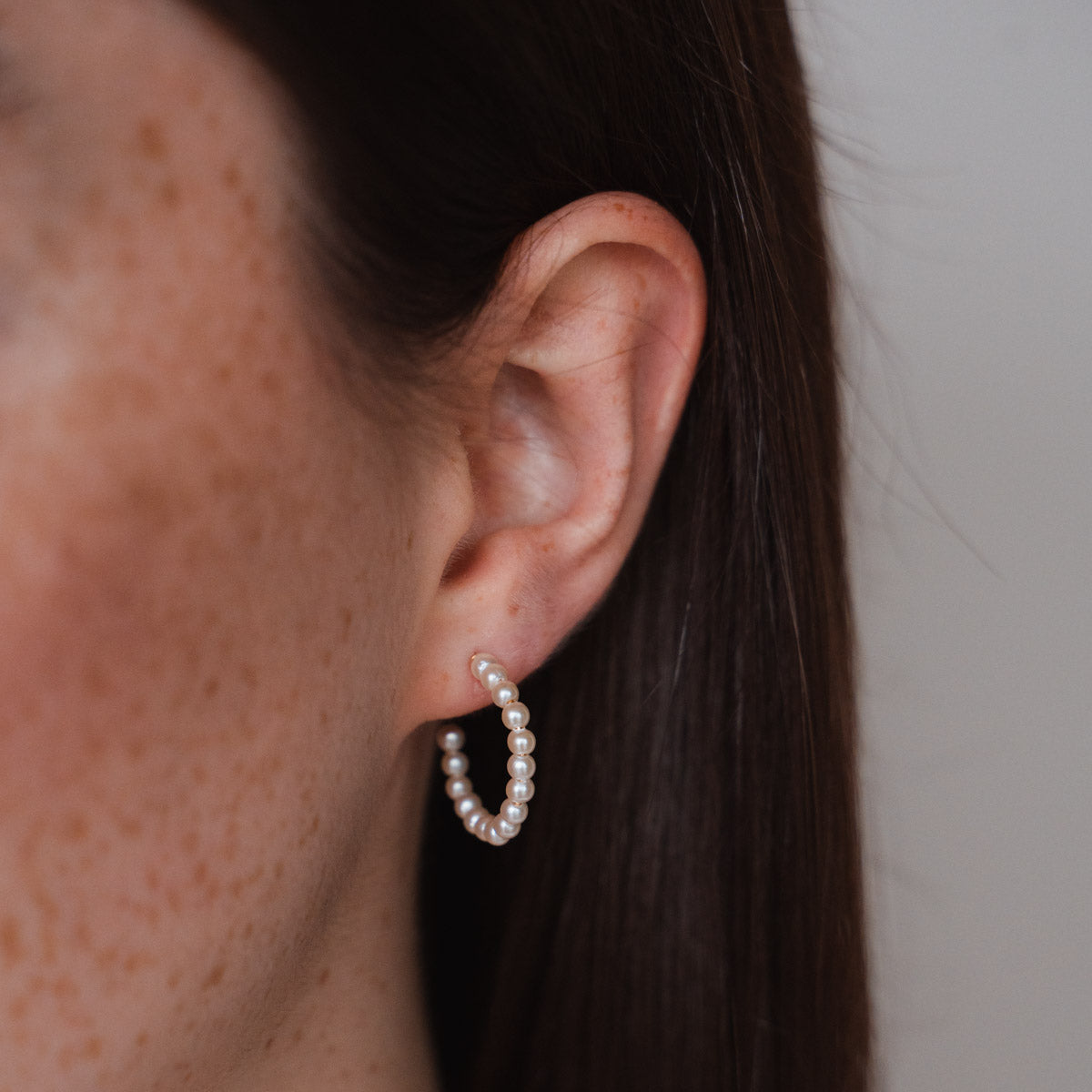 Die zarten Perlen der Sophie Ohrringe sind zeitlos und unterstreichen die feminine Eleganz der Trägerin. Die Kombination der zarten Perlen und dem eleganten Design machen diese Creolen zu etwas ganz Besonderem.