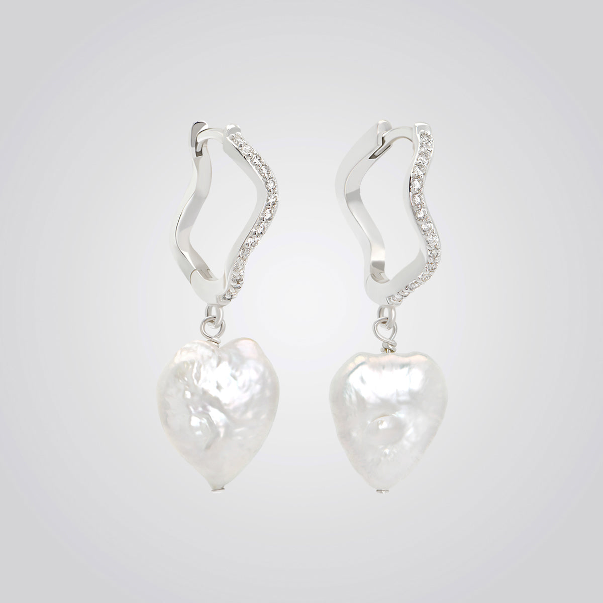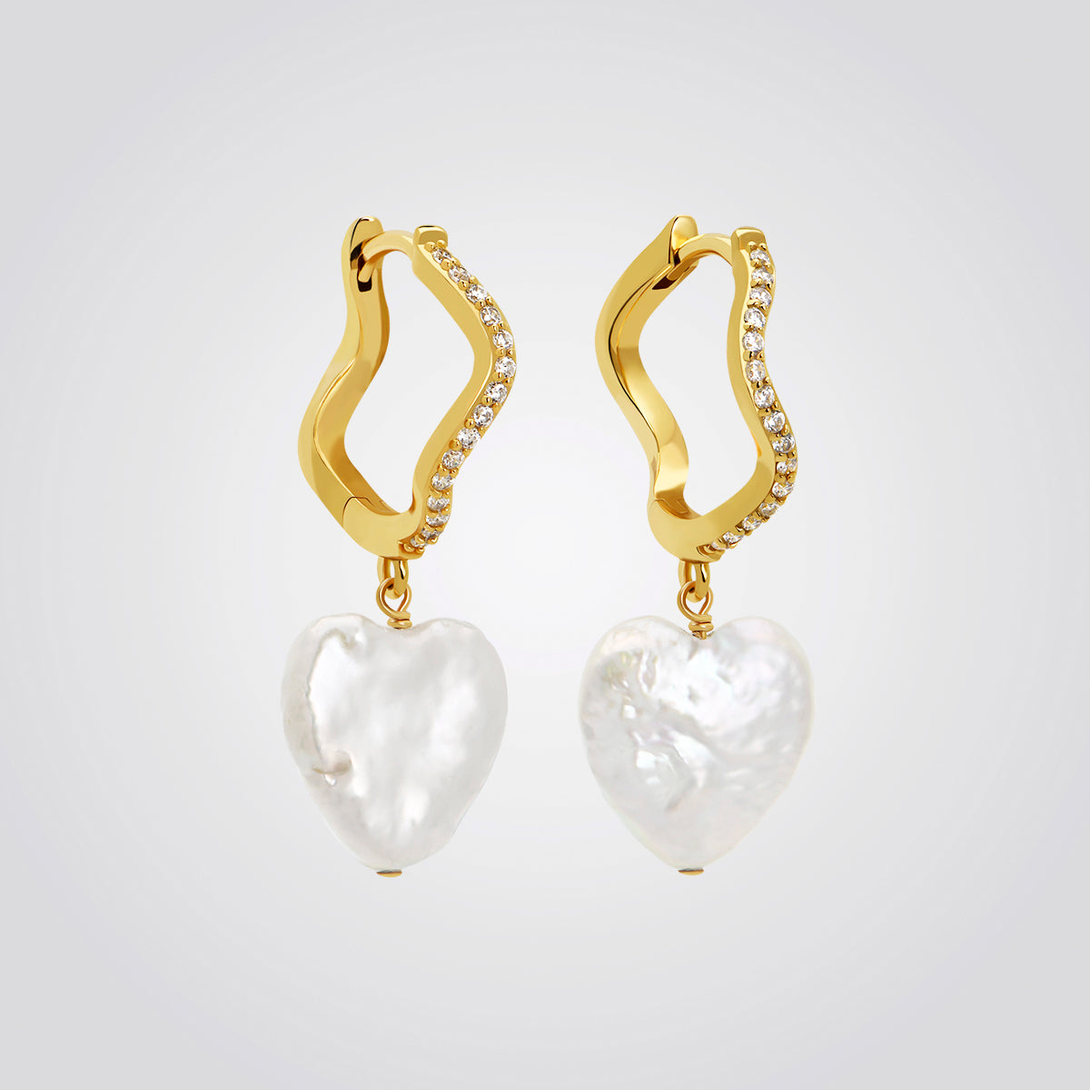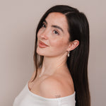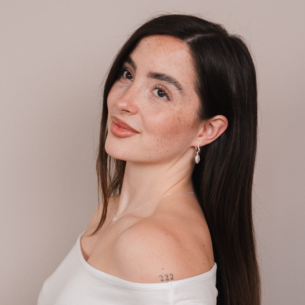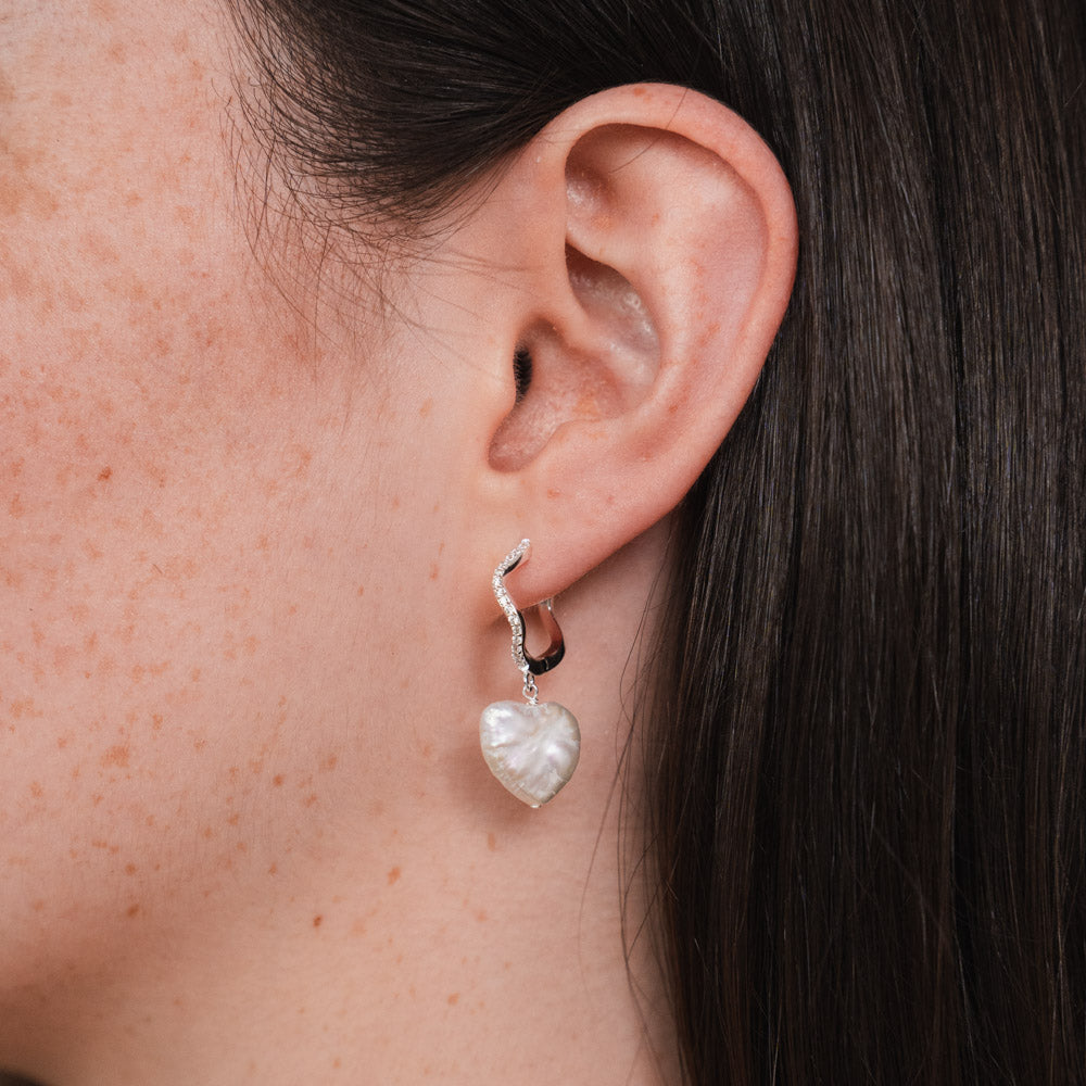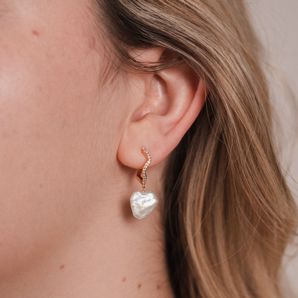 Arabella verbindet organische Eleganz mit modernem Design. Die geschwungenen Huggie Hoops mit funkelndem Zirkonia-Pavé treffen auf einen ausdrucksstarken Herzanhänger aus weißer Süßwasser-Barockperle. Das Zusammenspiel aus fließender Form, zartem Glanz und natürlicher Perlenstruktur macht Arabella zu einem femininen Statement – edel, aber nicht verspielt. Ein besonderes Piece für Alltag und besondere Anlässe.
