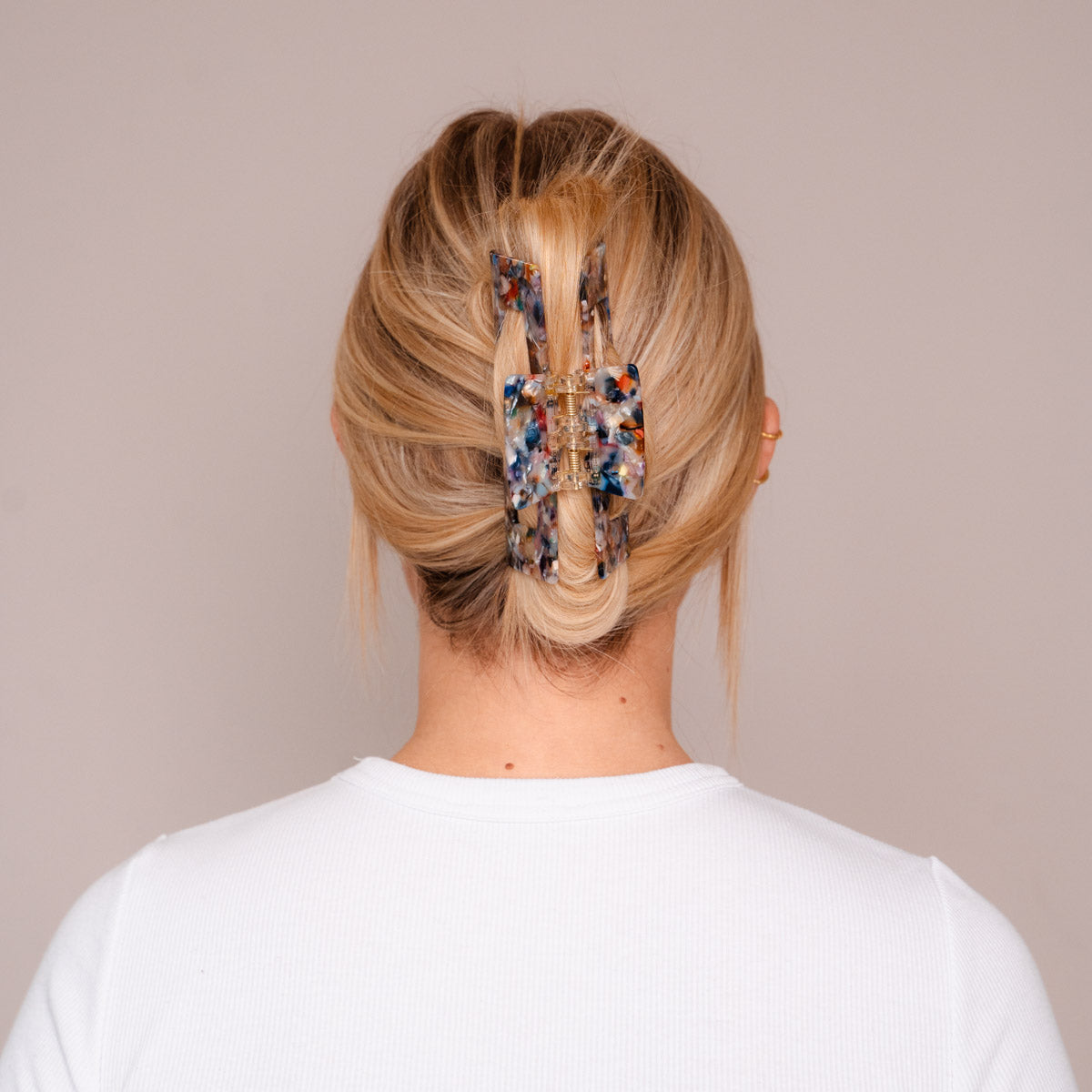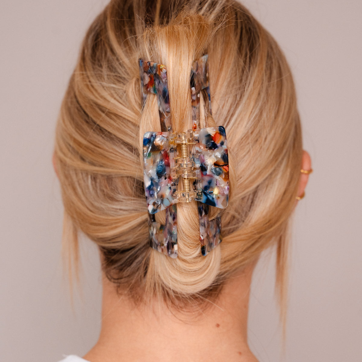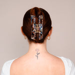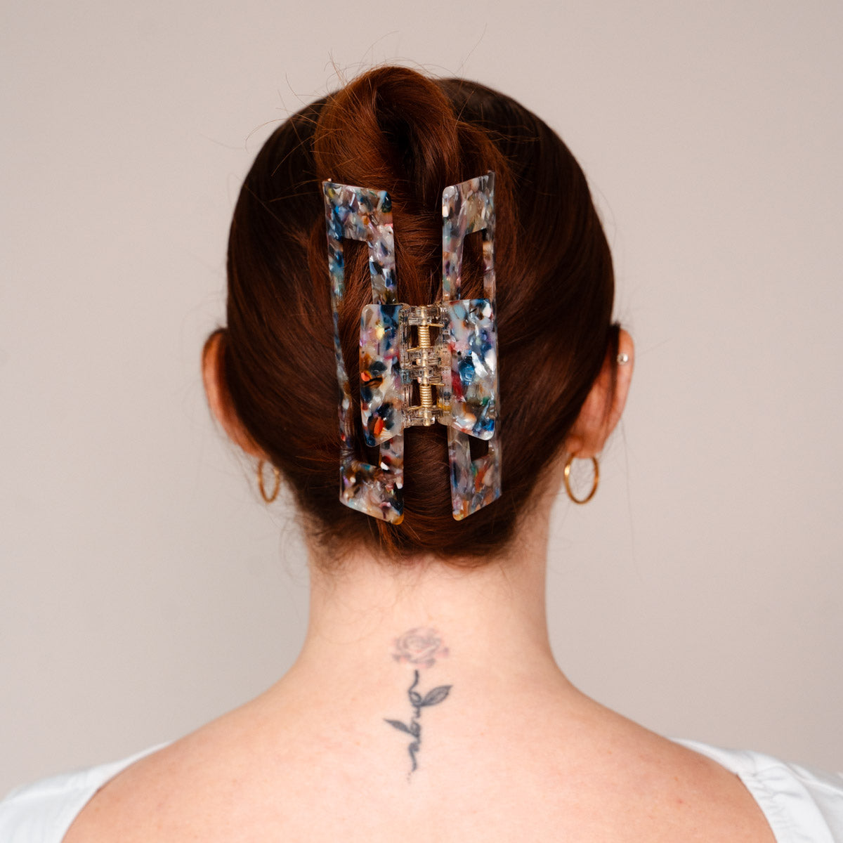 ADRIANA ist ein Must-Have für deine ultra dicken Haare. Mit zwei Federn bietet die Klammer extra starken Halt, der dein Haar sicher und fest hält, egal was du vorhast, selbst wenn andere Klammern versagen. ADRIANA ist Teil unserer XL Haarklammern Family und somit für big hair girls die Go-To Haarklammer. Das vielseitige bunte Design verbindet Style und Stil, einen entspannten Look mit klassischer Eleganz. Mit der Haarspange wird dein Outfit mühelos edel wirken: unaufdringlich, aber nicht zu übersehen.
