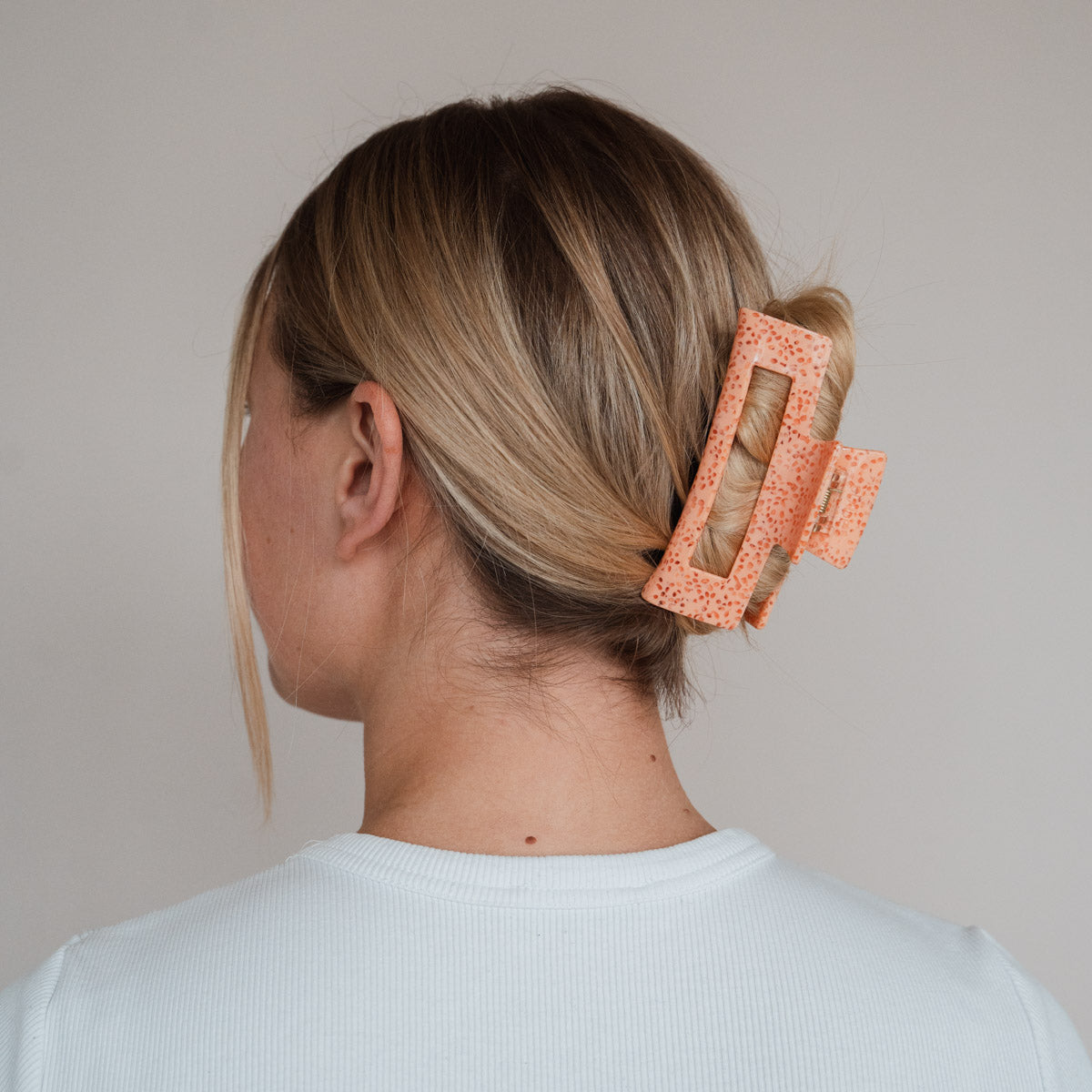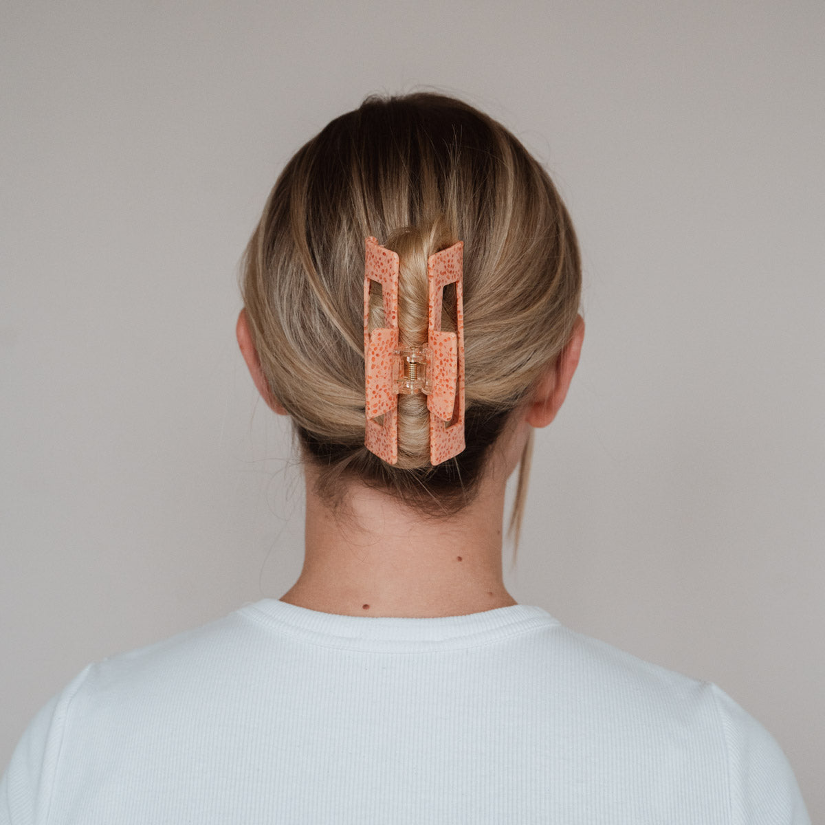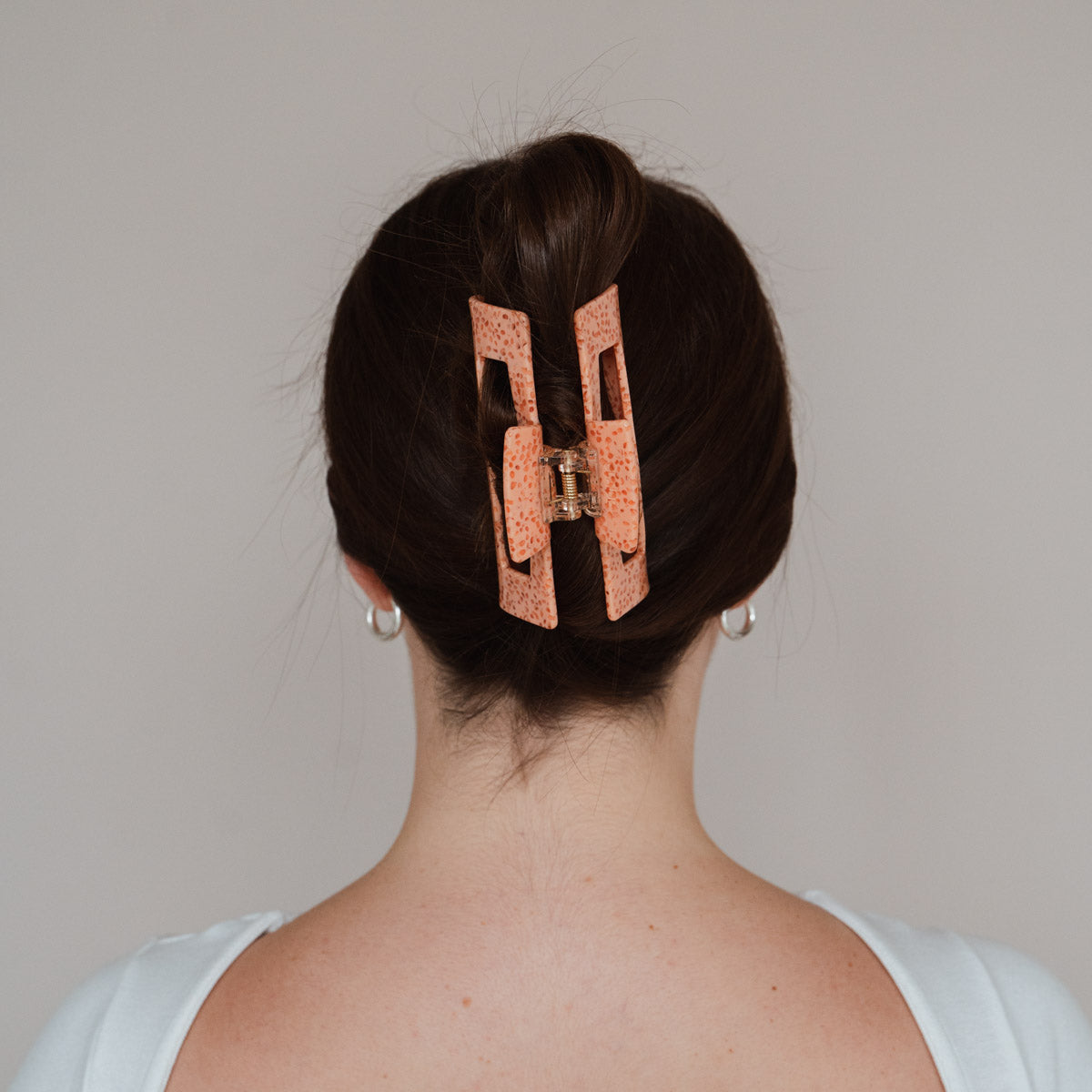 Die Hilda Haarklammer ist ein Must-Have für deine Haare. Egal ob viel Haar, langes Haar, lockiges Haar oder alles in Kombination: sie hält einfach immer, selbst wenn andere Haarspangen versagen. Mit ihrem Peach Design lässt sich die Hilda Haarklammer mühelos in jede Frisur integrieren und bietet dabei einen zuverlässigen Halt, ohne die Haare zu beschädigen oder zu strapazieren. Egal ob du sie täglich nutzt oder für besondere Abenteuer - unsere Hilda Haarklammer ist ein unverzichtbares Accessoire.