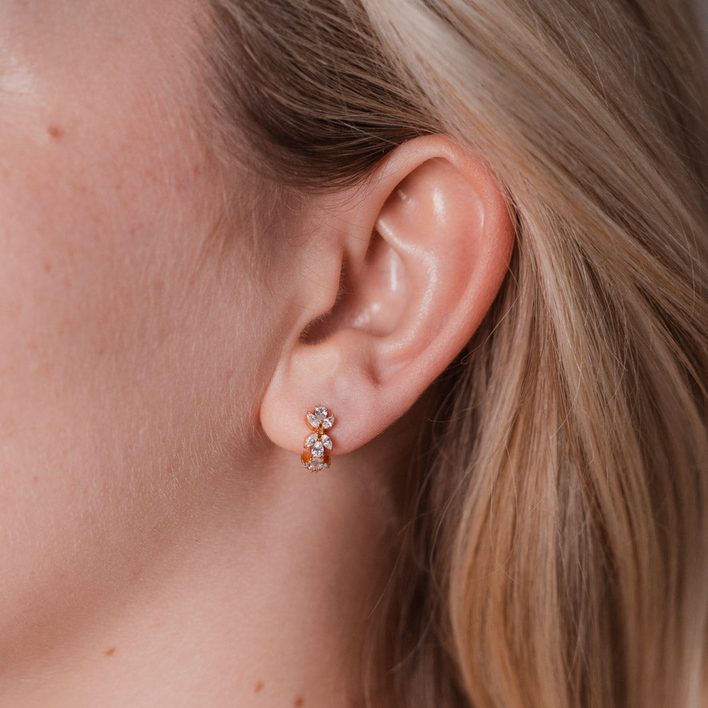Die Amelia Ohrringe vereinen elegantes Design mit funkelnden Marquise-Steinen, die das Licht aus jedem Winkel reflektieren. Die eng anliegenden Creolen sorgen für einen sicheren Sitz und verleihen deinem Look eine luxuriöse Ausstrahlung – ideal für besondere Anlässe und glamouröse Alltagsmomente.