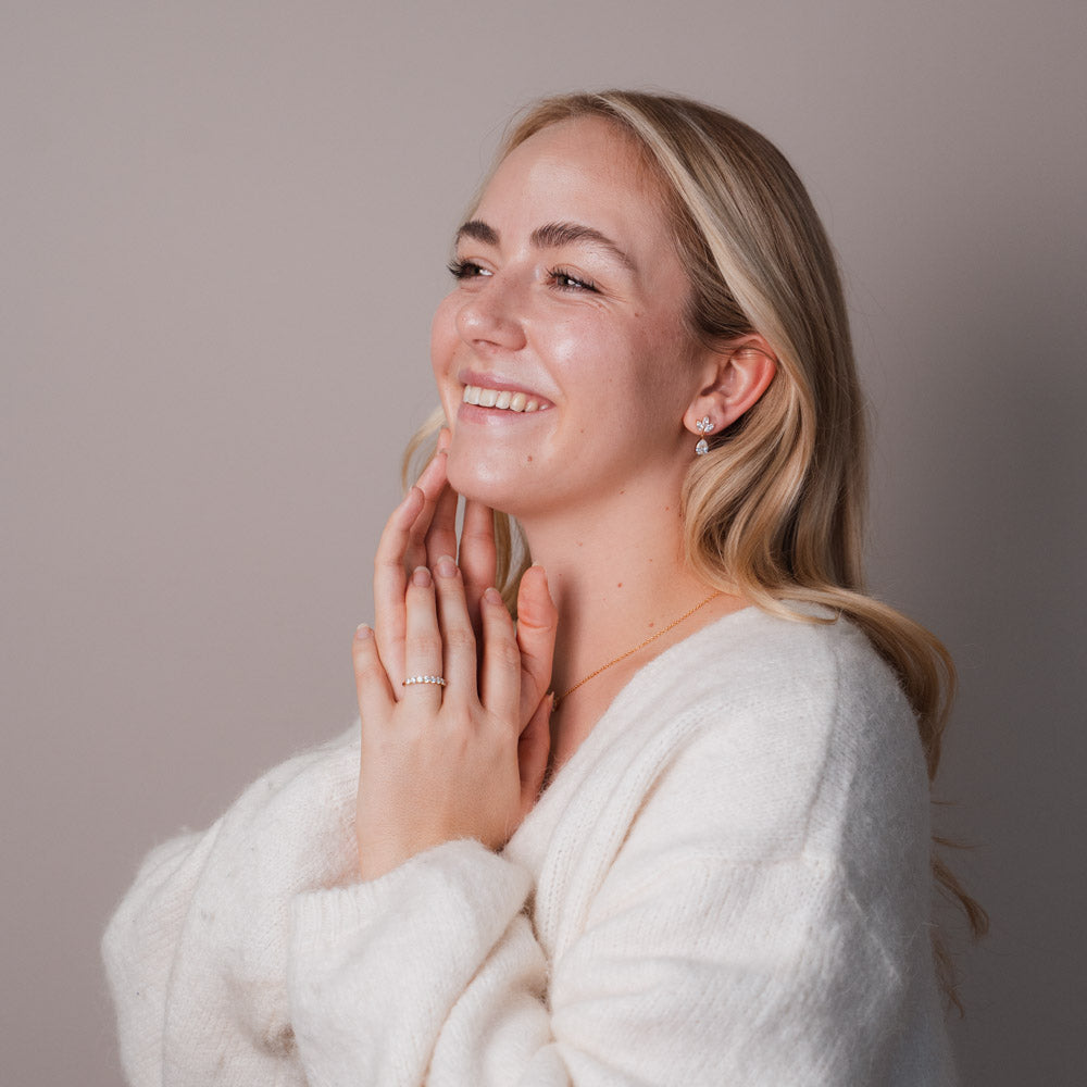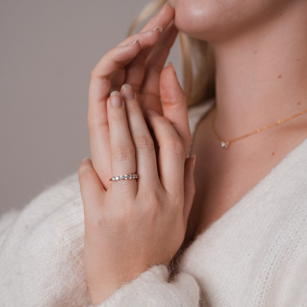 Klassisch, edel und zeitlos: Der Clara Ring beeindruckt mit einem vollständigen Eternity-Look. Rundum gesetzte Zirkonia lassen ihn in jeder Bewegung strahlen und machen ihn zum idealen Begleiter – ob solo oder als funkelndes Layering-Piece.