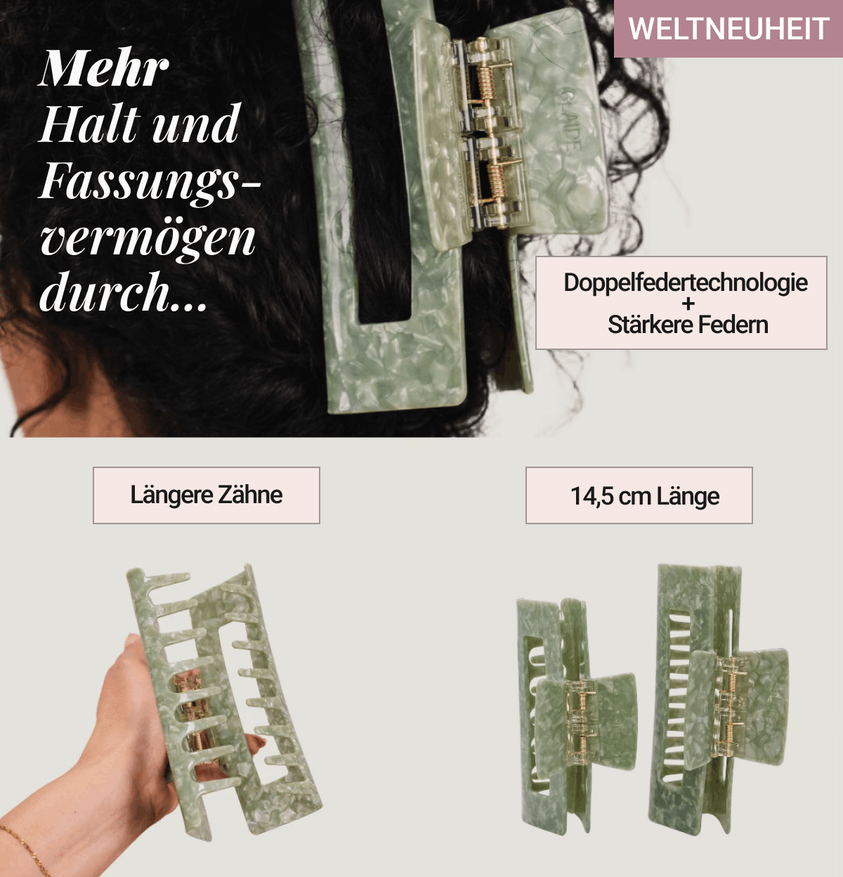 • Verlängerte Greifzähne – fassen mehr Haarvolumen, halten es sicher an Ort und Stelle