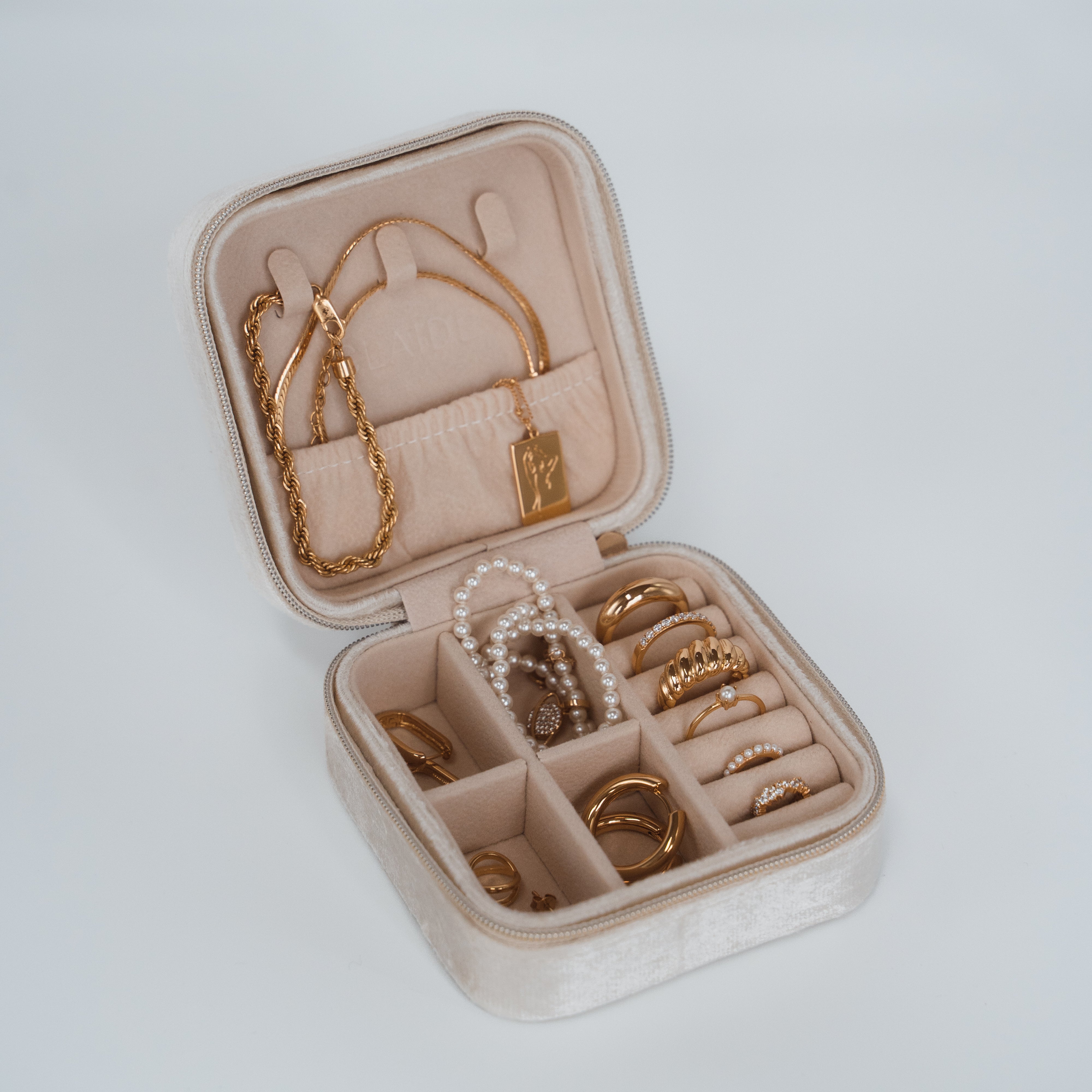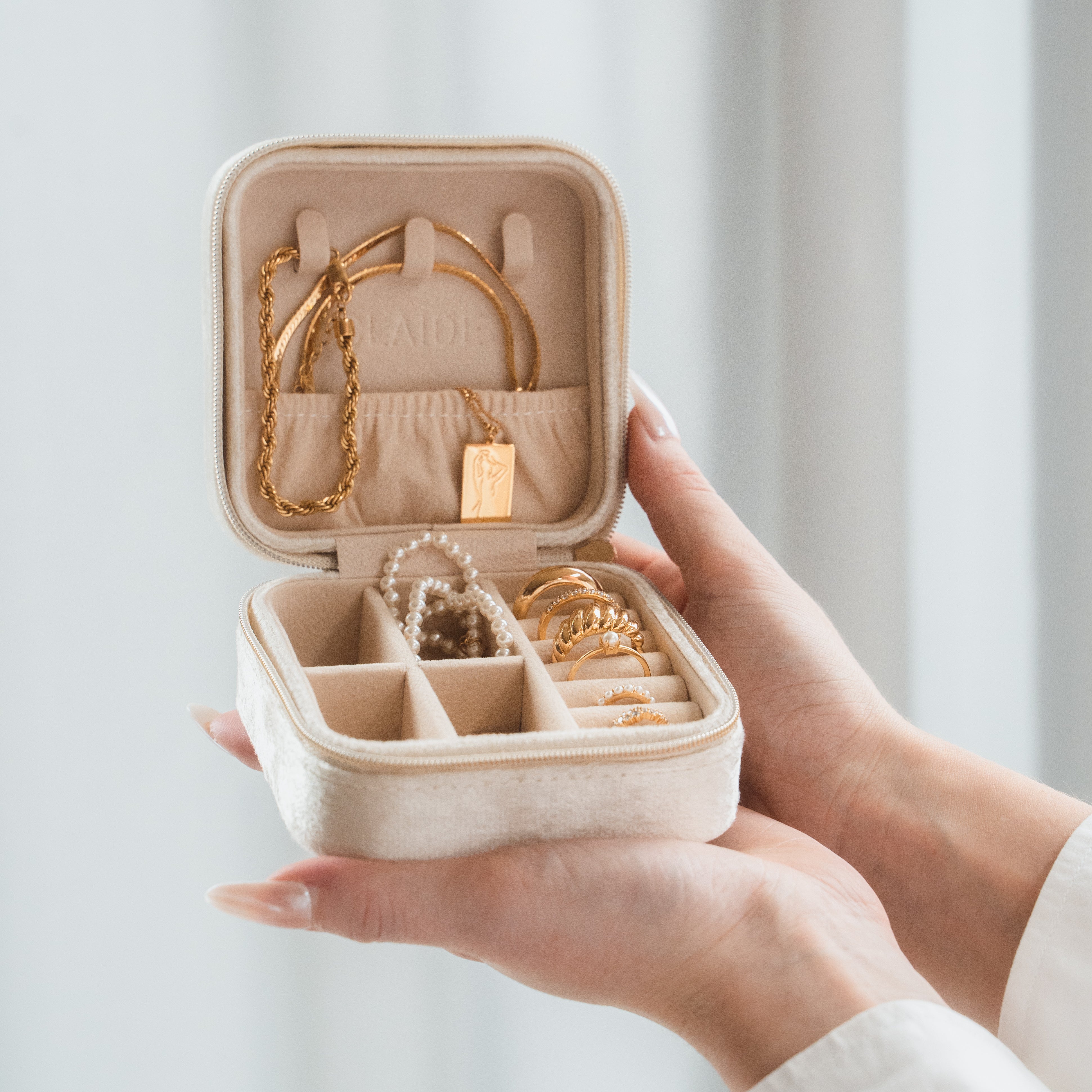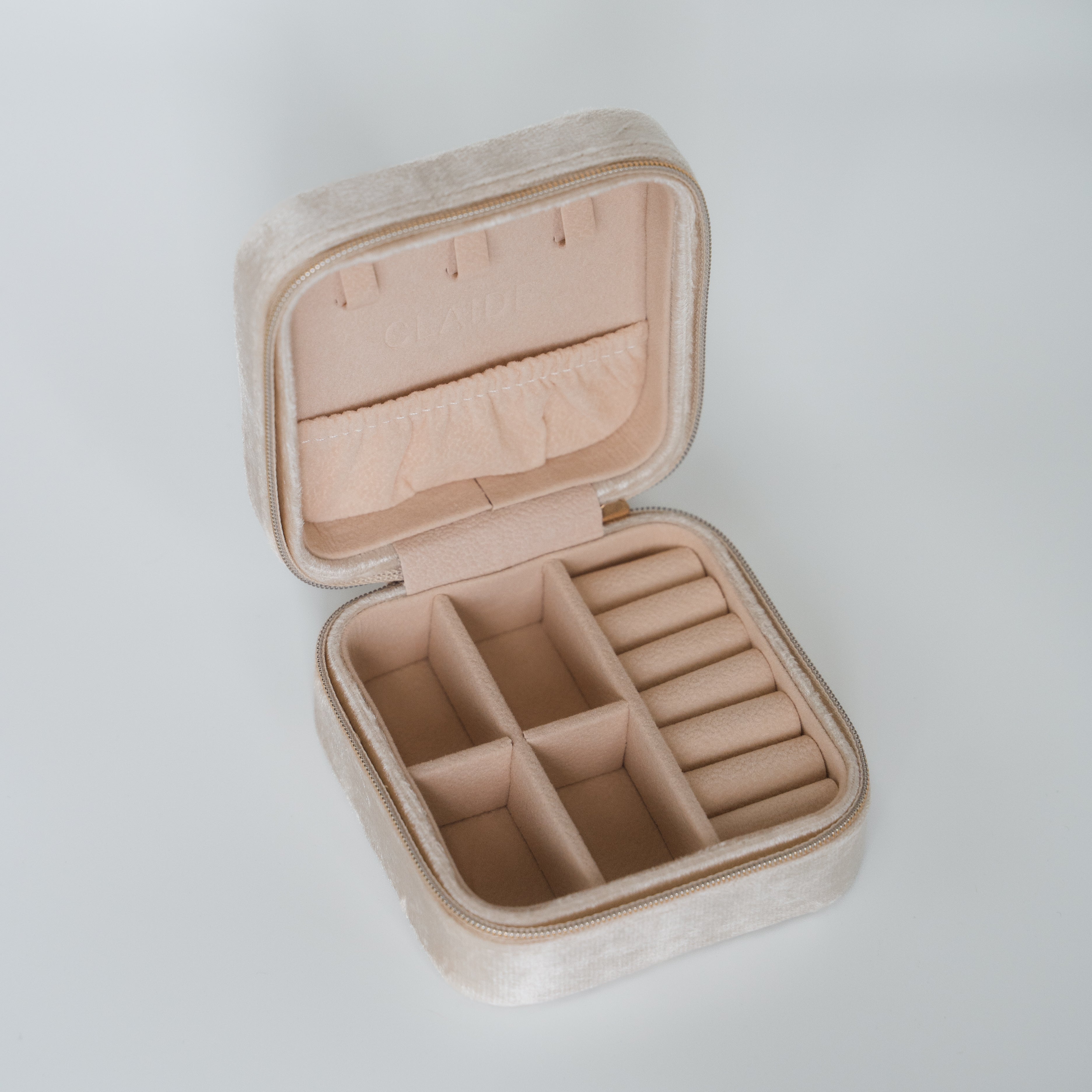 Verstaue deine Schmuckstücke auf Reisen platzsparend und sicher - Das aufklappbare Reiseetui mit Reißverschluss und geprägtem CLAIDE Logo liefert die Lösung!