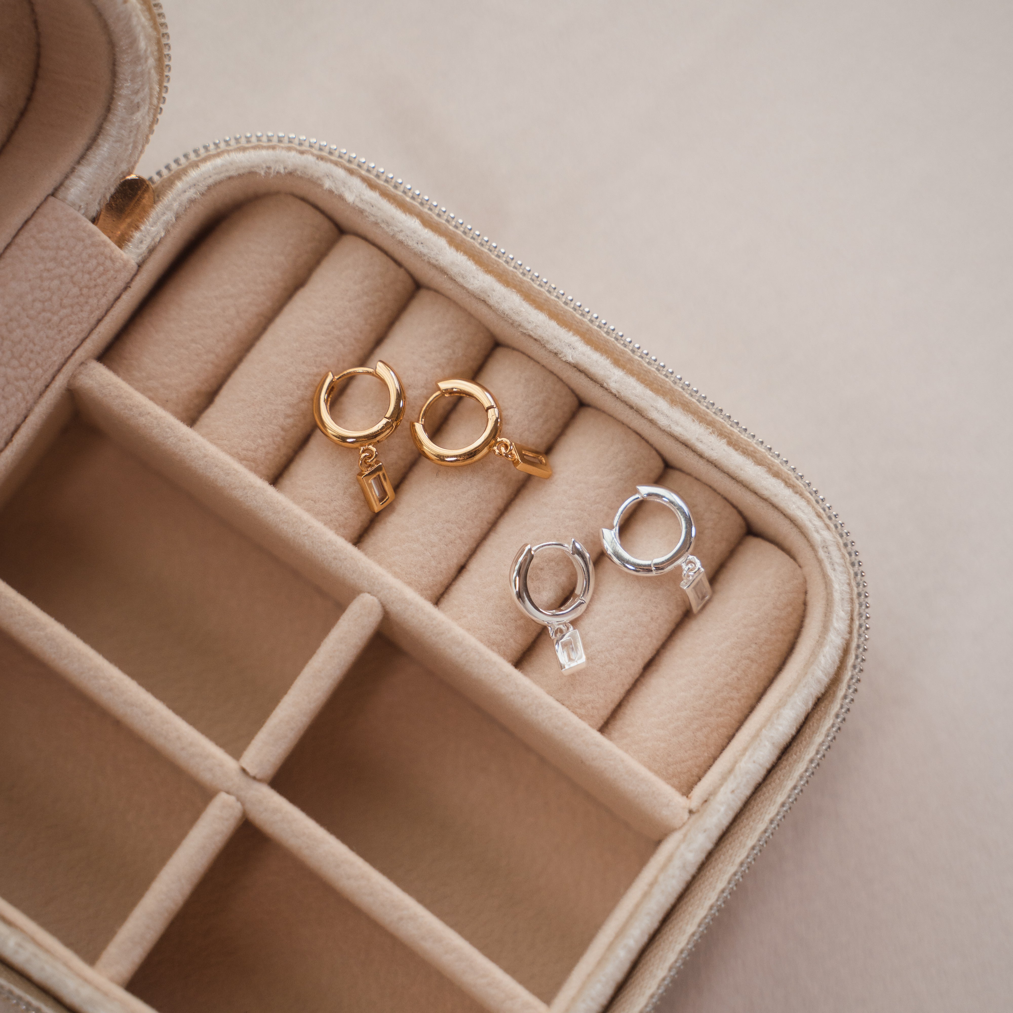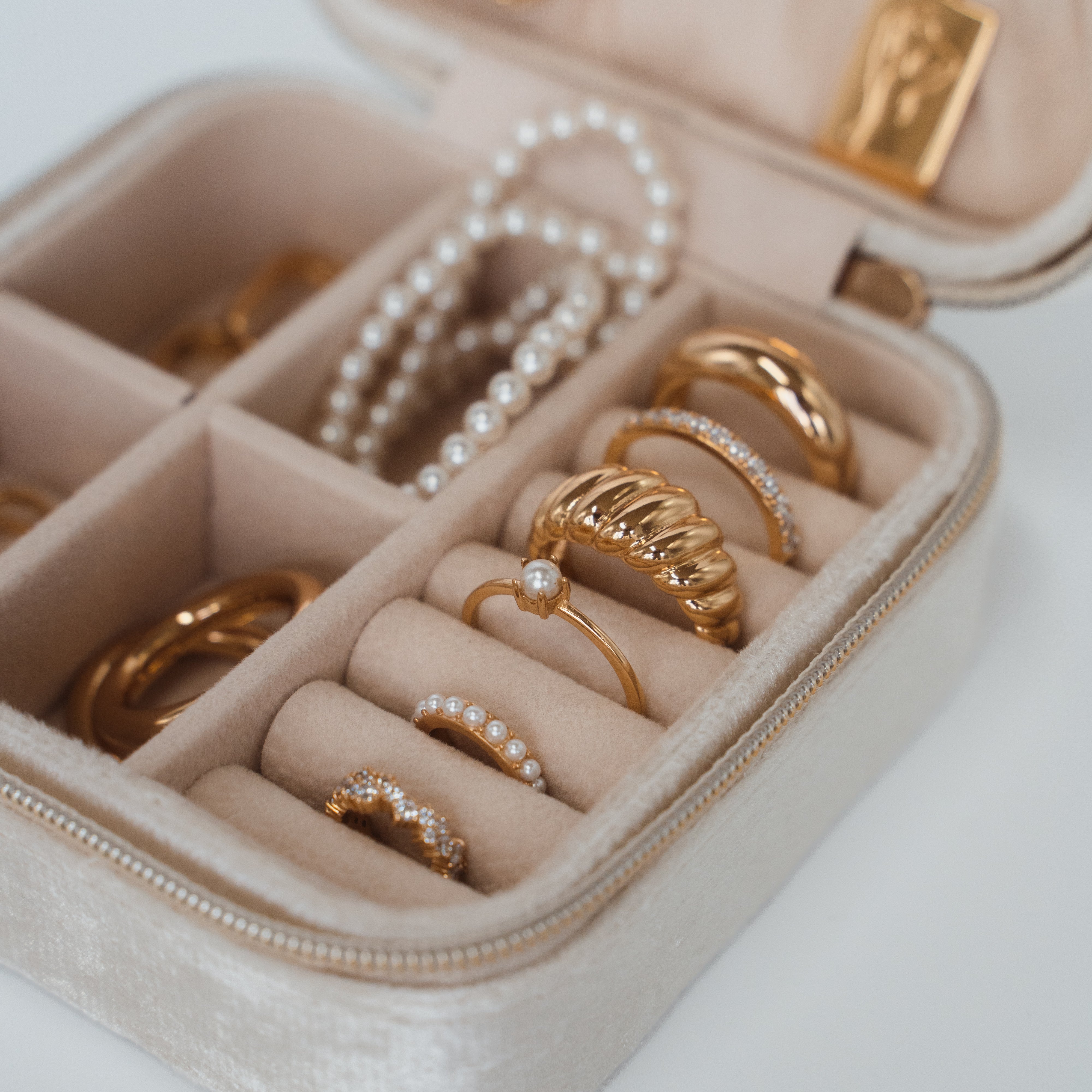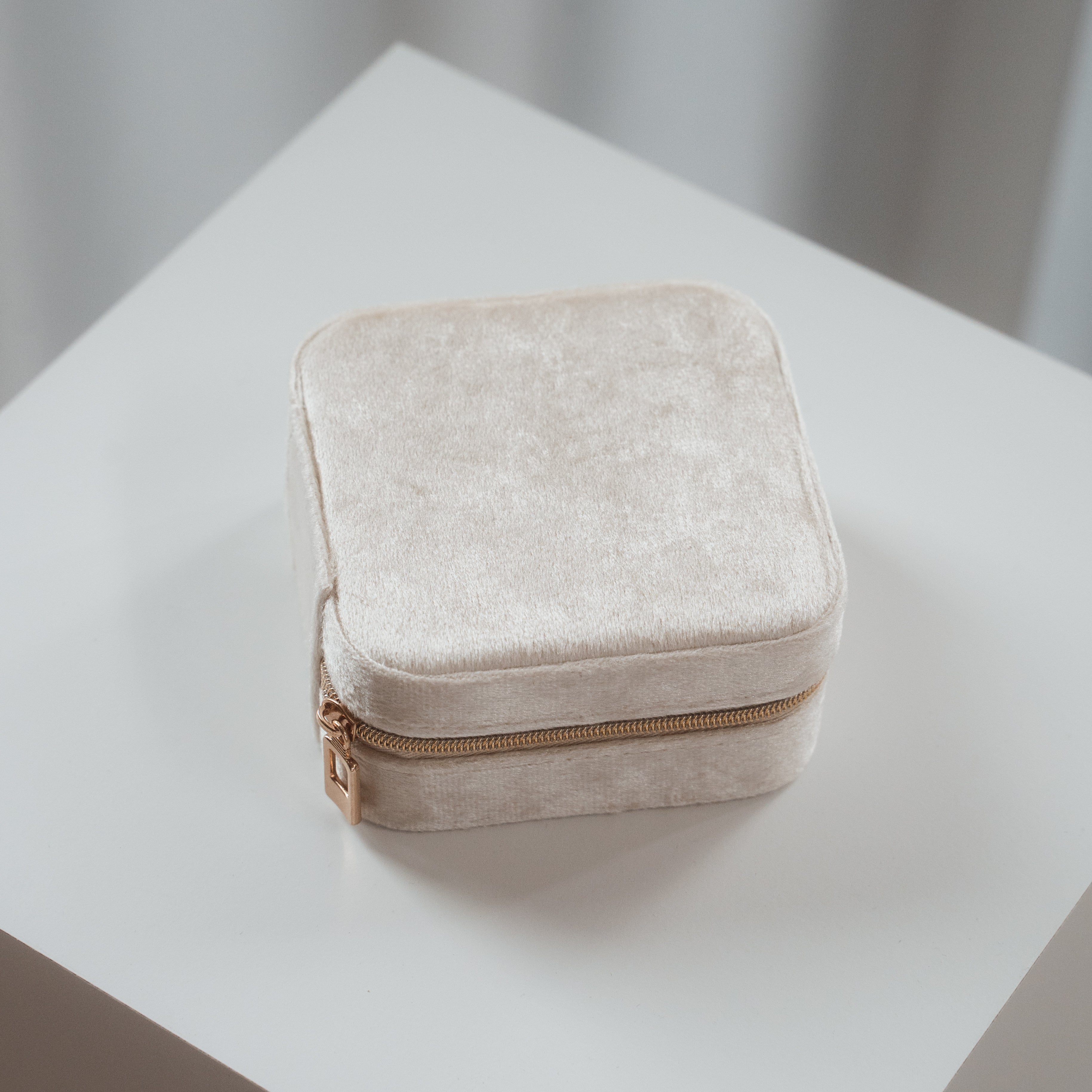 Verstaue deine Schmuckstücke auf Reisen platzsparend und sicher - Das aufklappbare Reiseetui mit Reißverschluss und geprägtem CLAIDE Logo liefert die Lösung!