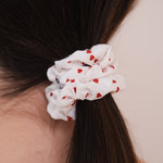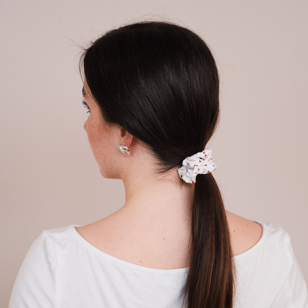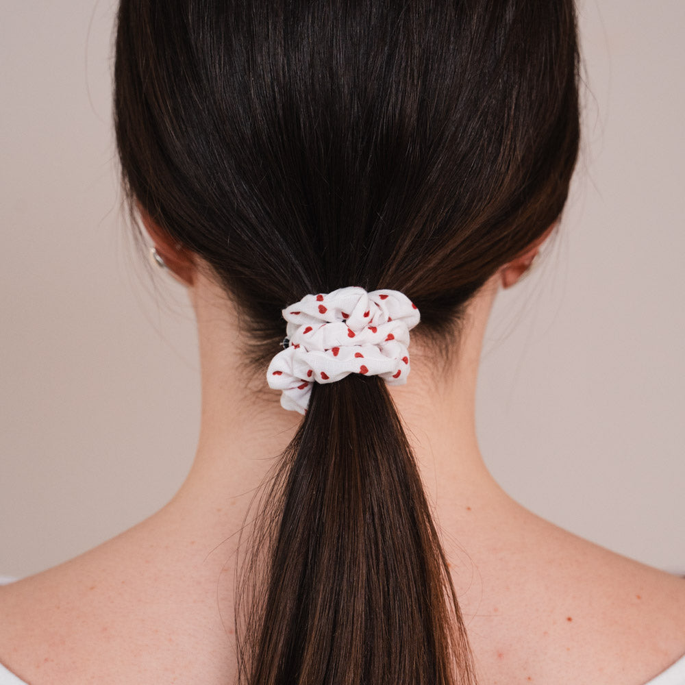 Entdecke unseren Selena Scrunchie und bringe deine Frisuren auf das nächste Level! Mit seinem hellen Design und den feinen roten Herzmotiven ist es ein besonderer Hingucker. Dank der kompakten Größe ist es perfekt für unterwegs und lässt sich problemlos in jeder Tasche oder am Handgelenk verstauen. Das Selena Scrunchie eignet sich sowohl für feineres als auch für dickeres Haar. Lass dich von dem angenehmen Tragegefühl unserer Scrunchies aus 100% Baumwolle überzeugen – eine sanfte Alternative zu herkömmlichen Haargummis.
