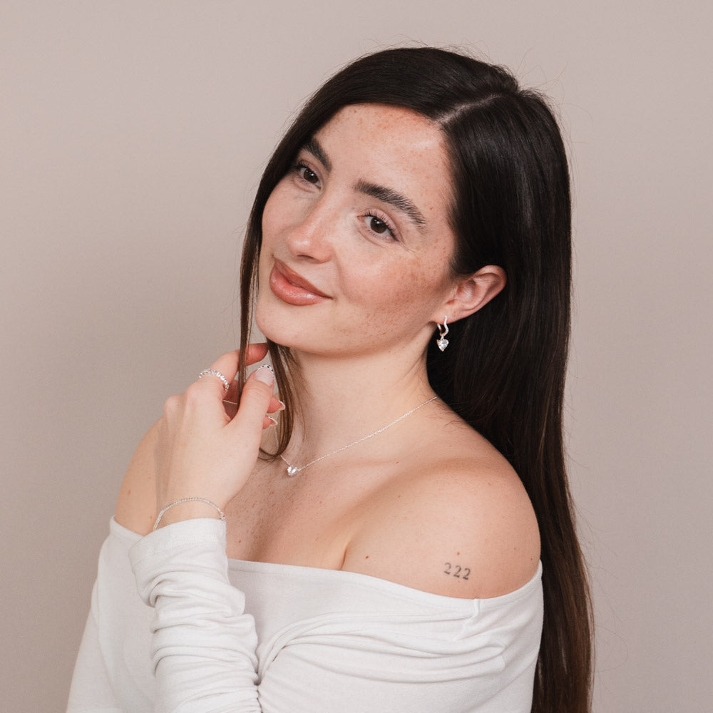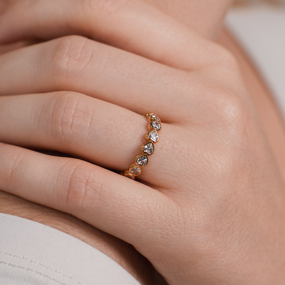 Der Sia Ring verbindet klare Linien mit feinem Glanz. Eingelassene Herzsteine setzen dezente Akzente und verleihen dem Design eine besondere Tiefe. Modern, vielseitig und perfekt solo oder im Stack.