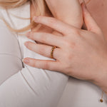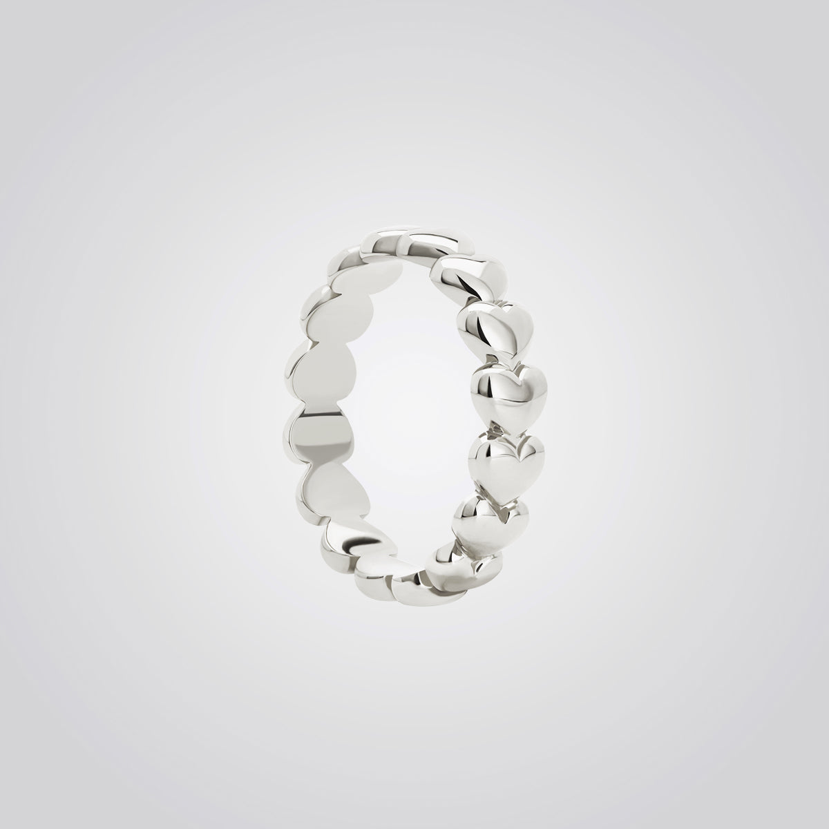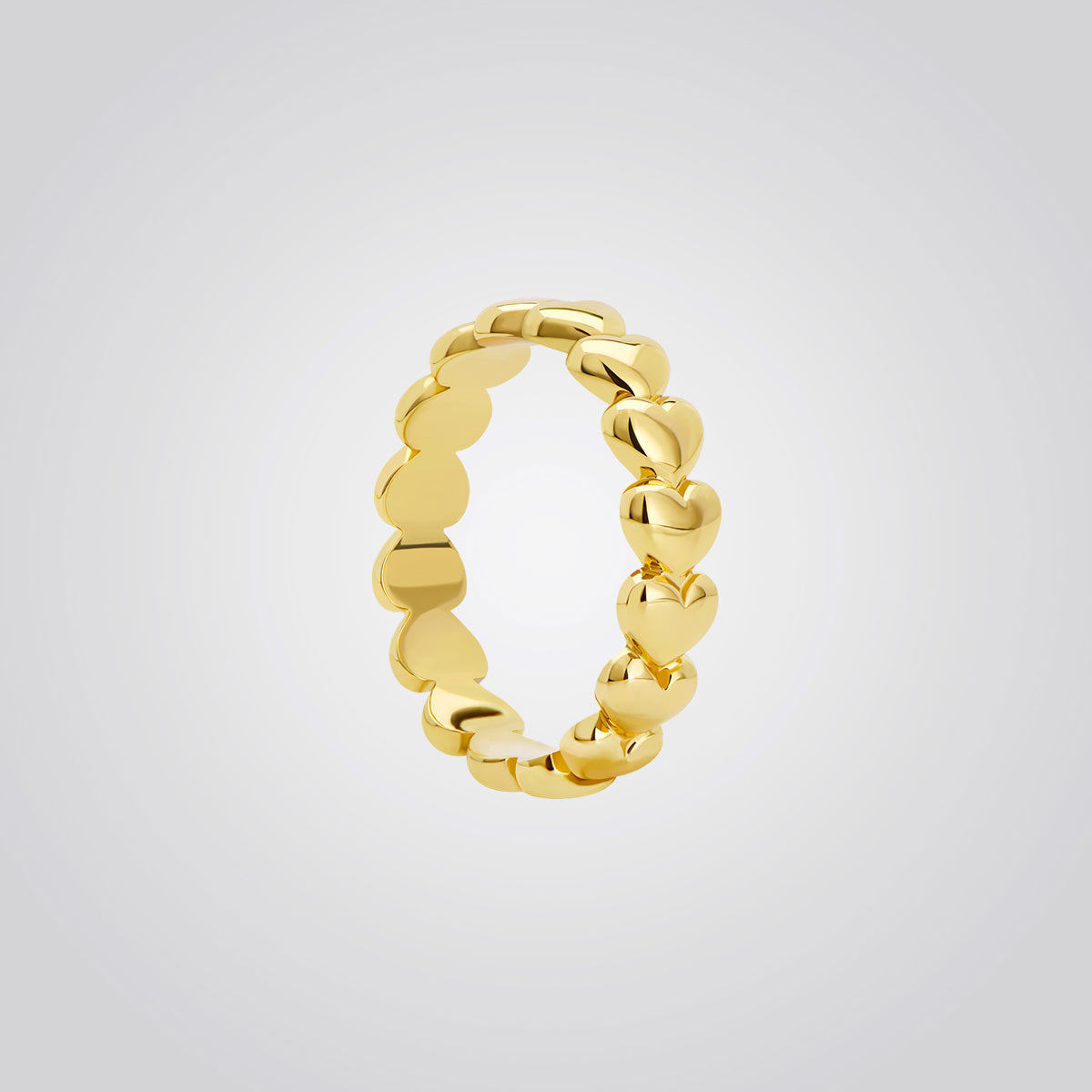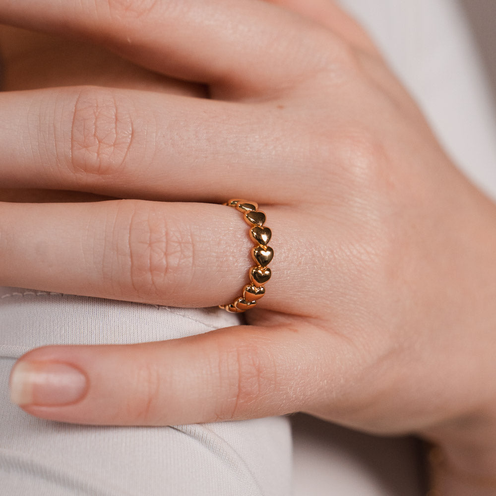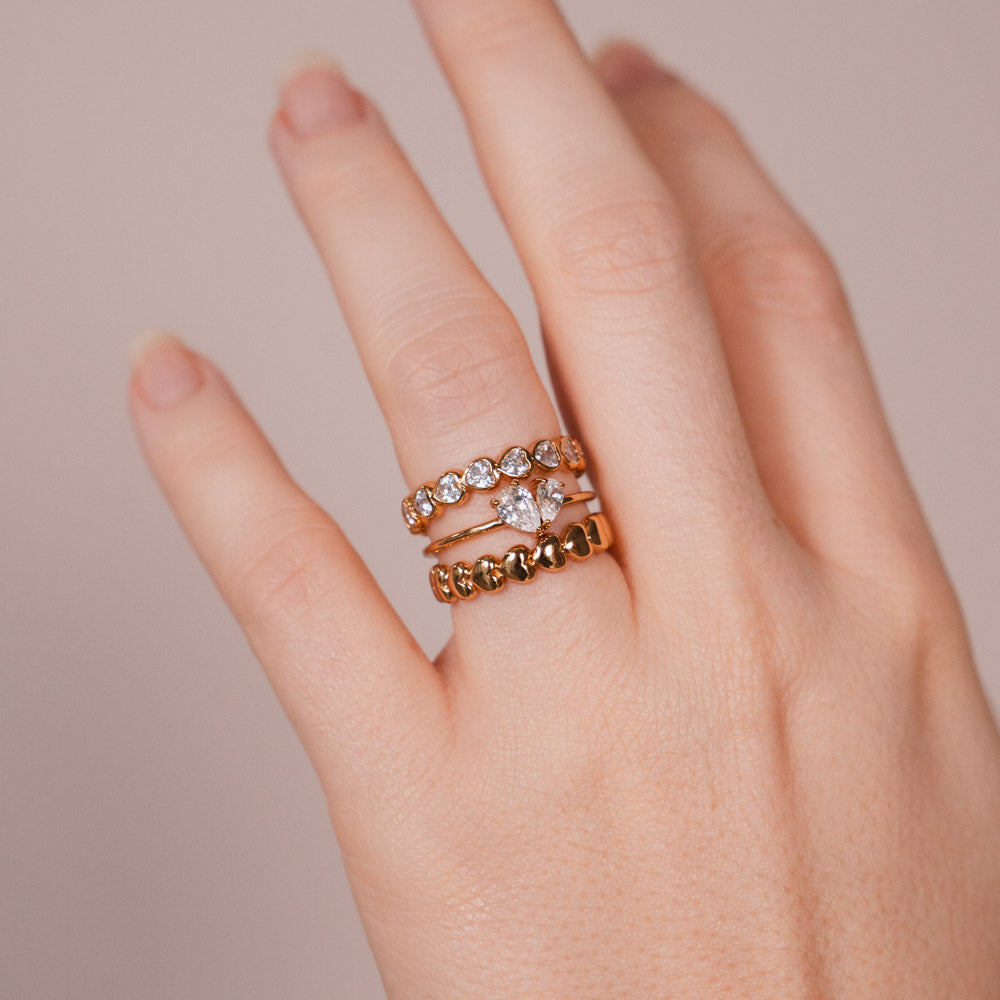Der Vaya Ring setzt auf ein klares Statement: Aneinandergereihte Herzformen bilden eine moderne, durchgehende Ringsilhouette. Poliert, ausdrucksstark und dennoch clean – ein Ring, der solo wirkt und im Stack begeistert.